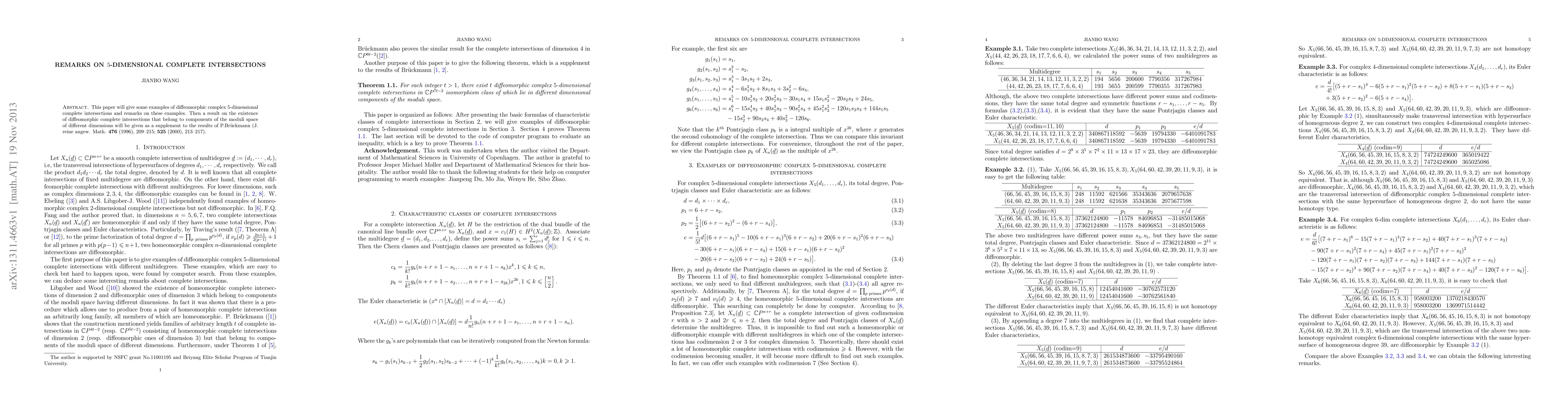 This paper will give some examples of diffeomorphic complex 5-dimensional complete intersections and remarks on these examples. Then a result on the existence of diffeomorphic complete intersections that belong to components of the moduli space of different dimensions will be given as a supplement to the results of P.Br\"uckmann (J. reine angew. Math. 476 (1996), 209-215; 525 (2000), 213-217).