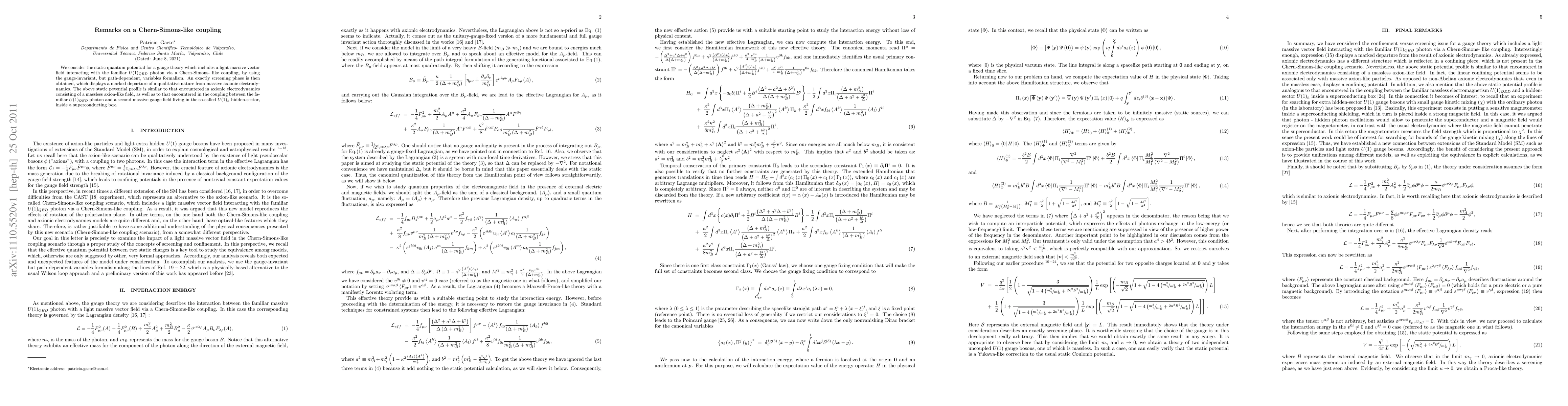 We consider the static quantum potential for a gauge theory which includes a light massive vector field interacting with the familiar $U(1)_{QED}$ photon via a Chern-Simons- like coupling, by using the gauge-invariant, but path-dependent, variables formalism. An exactly screening phase is then obtained, which displays a marked departure of a qualitative nature from massive axionic electrodynamics. The above static potential profile is similar to that encountered in axionic electrodynamics consisting of a massless axion-like field, as well as to that encountered in the coupling between the familiar $U(1)_{QED}$ photon and a second massive gauge field living in the so-called $U(1)_h$ hidden-sector, inside a superconducting box.