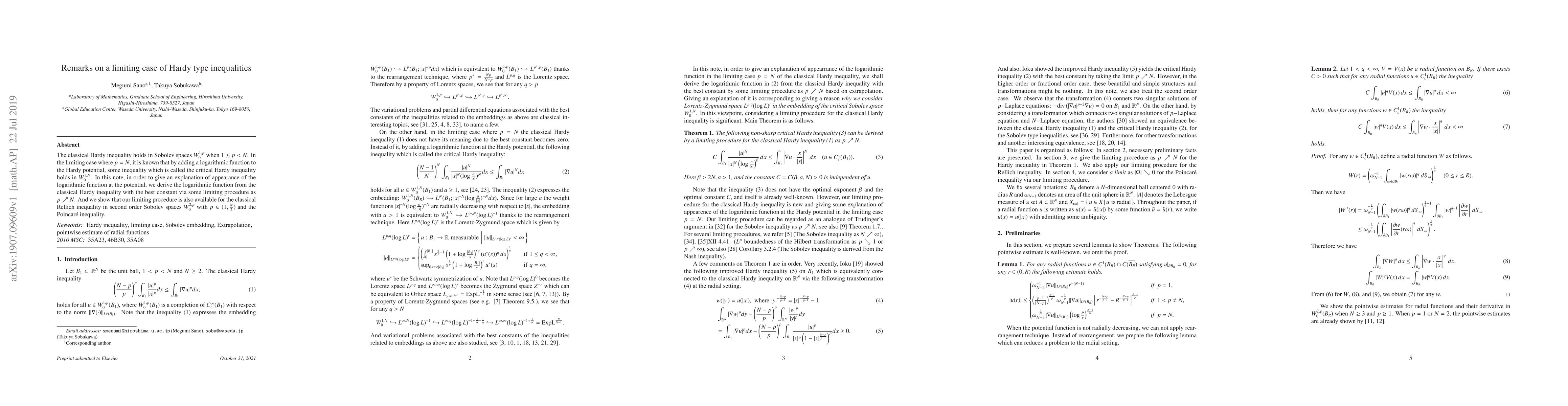 The classical Hardy inequality holds in Sobolev spaces $W_0^{1,p}$ when $1\le p< N$. In the limiting case where $p=N$, it is known that by adding a logarithmic function to the Hardy potential, some inequality which is called the critical Hardy inequality holds in $W_0^{1,N}$. In this note, in order to give an explanation of appearance of the logarithmic function at the potential, we derive the logarithmic function from the classical Hardy inequality with the best constant via some limiting procedure as $p \nearrow N$. And we show that our limiting procedure is also available for the classical Rellich inequality in second order Sobolev spaces $W_0^{2,p}$ with $p \in (1, \frac{N}{2})$ and the Poincar\'e inequality.