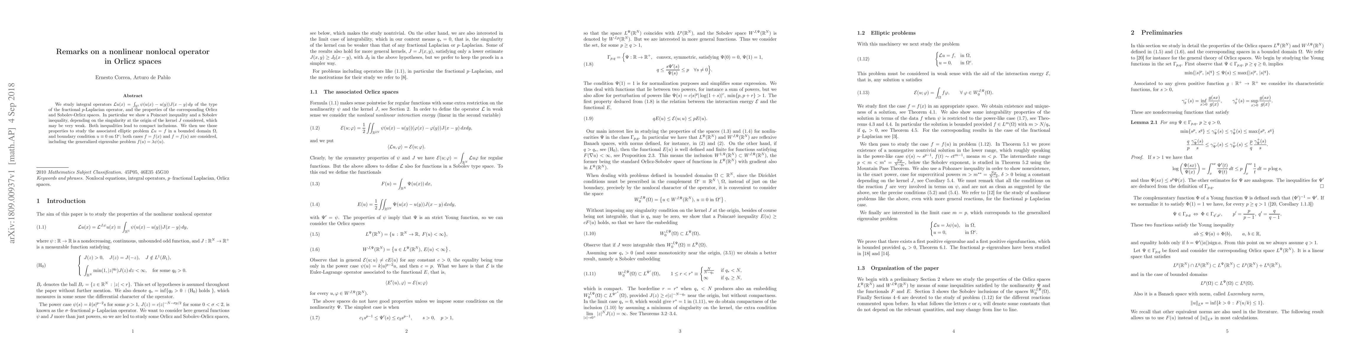 We study integral operators $\mathcal{L}u(x)=\int_{\mathbb{R^N}}\psi(u(x)-u(y))J(x-y)\,dy$ of the type of the fractional $p$-Laplacian operator, and the properties of the corresponding Orlicz and Sobolev-Orlicz spaces. In particular we show a Poincar\'e inequality and a Sobolev inequality, depending on the singularity at the origin of the kernel $J$ considered, which may be very weak. Both inequalities lead to compact inclusions. We then use those properties to study the associated elliptic problem $\mathcal{L}u=f$ in a bounded domain $\Omega$, and boundary condition $u\equiv0$ on $\Omega^c$; both cases $f=f(x)$ and $f=f(u)$ are considred, including the generalized eigenvalue problem $f(u)=\lambda\psi(u)$.