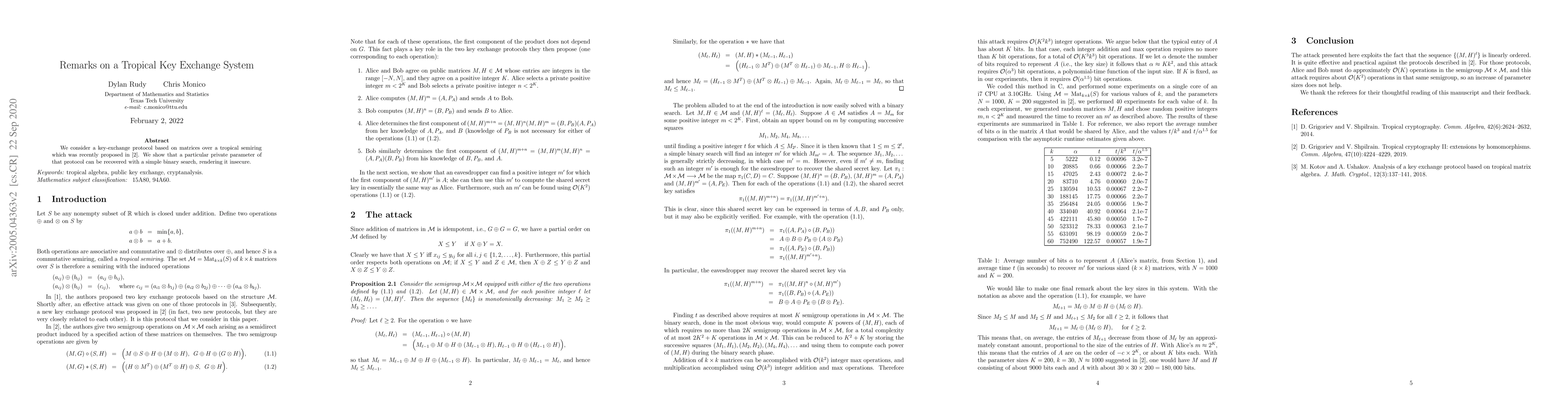 We consider a key-exchange protocol based on matrices over a tropical semiring which was recently proposed in \cite{grig19}. We show that a particular private parameter of that protocol can be recovered with a simple binary search, rendering it insecure.