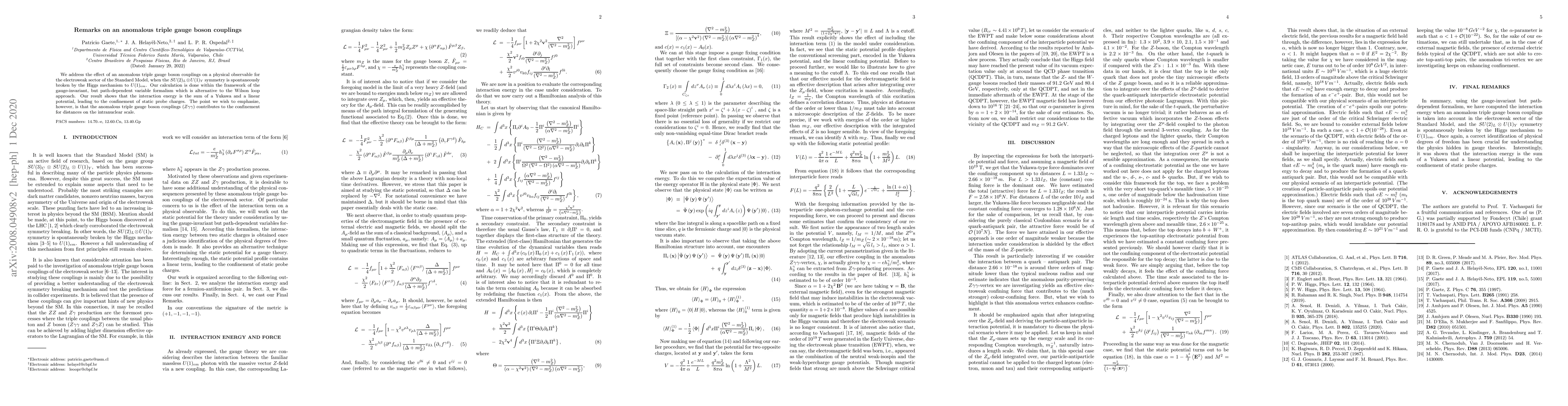 We address the effect of an anomalous triple gauge boson couplings on a physical observable for the electroweak sector of the Standard Model, when the $SU(2)_{L}\otimes U(1)_{Y}$ symmetry is spontaneously broken by the Higgs mechanism to $U(1)_{em}$. Our calculation is done within the framework of the gauge-invariant, but path-dependent variable formalism which is alternative to the Wilson loop approach. Our result shows that the interaction energy is the sum of a Yukawa and a linear potential, leading to the confinement of static probe charges. The point we wish to emphasize, however, is that the anomalous triple gauge boson couplings ($Z \gamma \gamma$) contributes to the confinement for distances on the intranuclear scale.