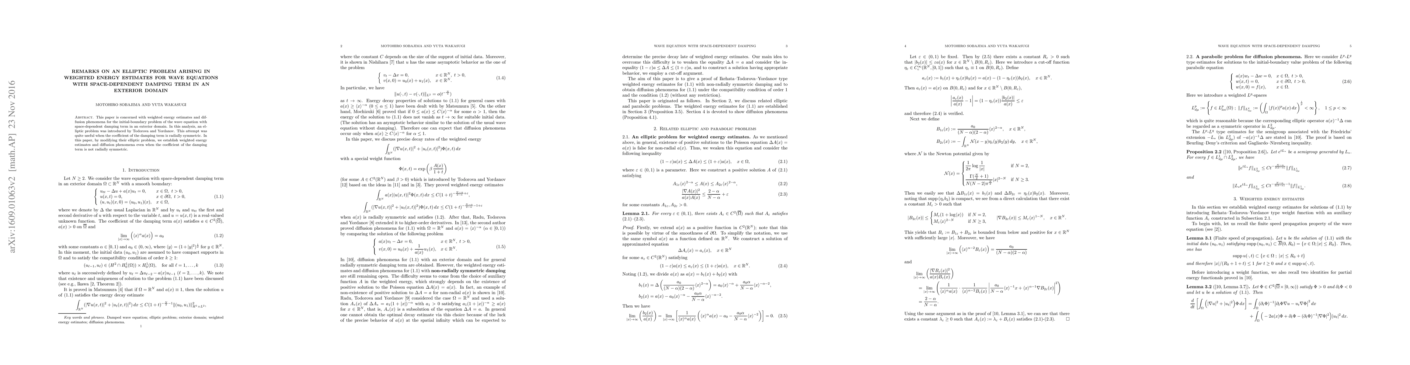 This paper modifies an elliptic problem introduced by Todorova and Yordanov to establish weighted energy estimates and diffusion phenomena for wave equations with non-radially symmetric space-dependent damping terms in exterior domains, extending previous results.