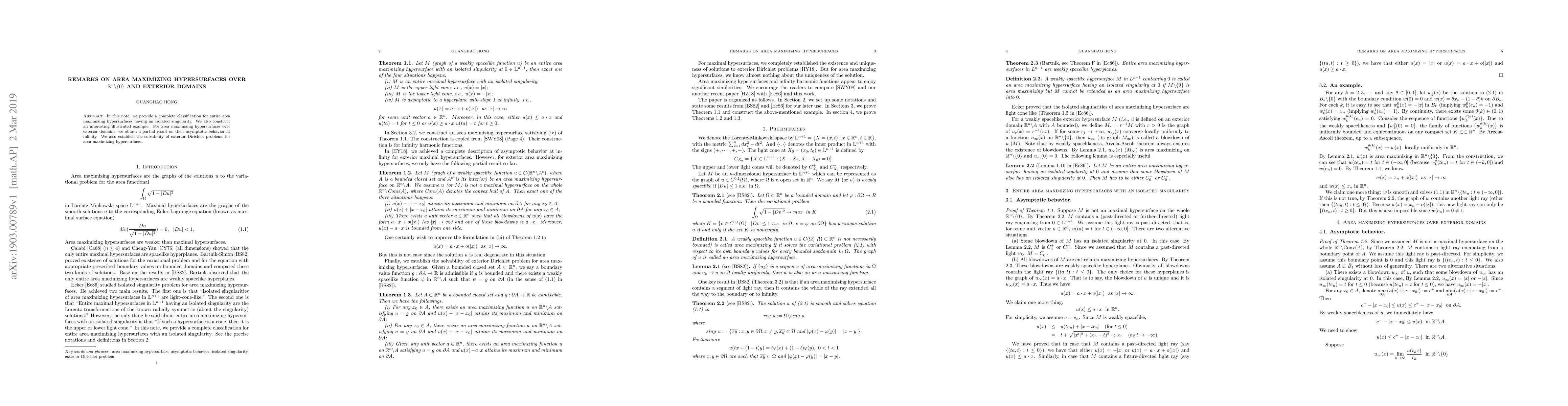 This paper classifies entire area maximizing hypersurfaces with isolated singularities and provides an illustrative example. It also partially analyzes the asymptotic behavior of such hypersurfaces in exterior domains and proves the solvability of exterior Dirichlet problems for them.