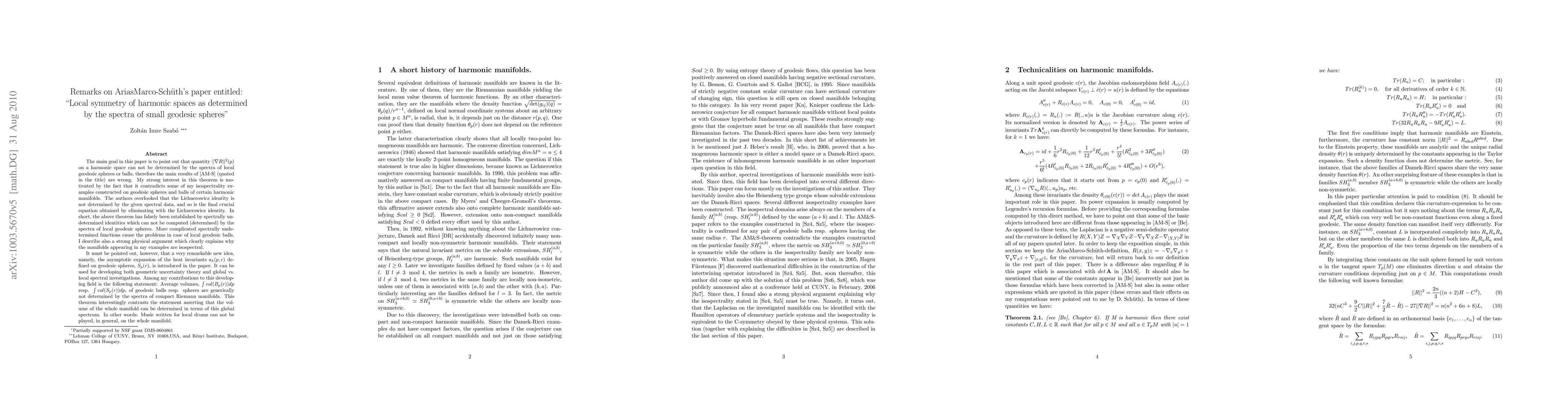 The main goal in this paper is to point out that quantity $||\nabla R||^2(p)$ on a harmonic space can not be determined by the spectra of local geodesic spheres or balls, therefore the main results of [AM-S] (quoted in the title) are wrong. My strong interest in the above theorem is motivated by the fact that it contradicts some of my isospectrality examples constructed on geodesic spheres and balls of certain harmonic manifolds. The authors overlooked that the Lichnerowicz identity is not determined by the given spectral data, and so is the final crucial equation obtained by eliminating with the Lichnerowicz identity. In short, the above theorem has falsely been established by spectrally undetermined identities which can not be computed (determined) by the spectra of local geodesic spheres. More complicated spectrally undetermined functions cause the problems also in case of local geodesic balls. I describe also a strong physical argument which clearly explains why the manifolds appearing in my examples are isospectral. It must be pointed out, however, that a very remarkable new idea, namely, the asymptotic expansion of the heat invariants $a_k(p,r)$ defined on geodesic spheres, $S_p(r)$, is introduced in the paper. It can be used for developing both geometric uncertainty theory and global vs. local spectral investigations. Among my contributions to this developing field is the following statement: Average volumes, $\int vol(B_p(r))dp$ resp. $\int vol(S_p(r))dp$, of geodesic balls resp. spheres are generically not determined by the spectra of compact Riemann manifolds. This theorem interestingly contrasts the statement asserting that the volume of the whole manifold can be determined in terms of this global spectrum. We also have: Music written for local drums can not be played, in general, on the whole manifold.