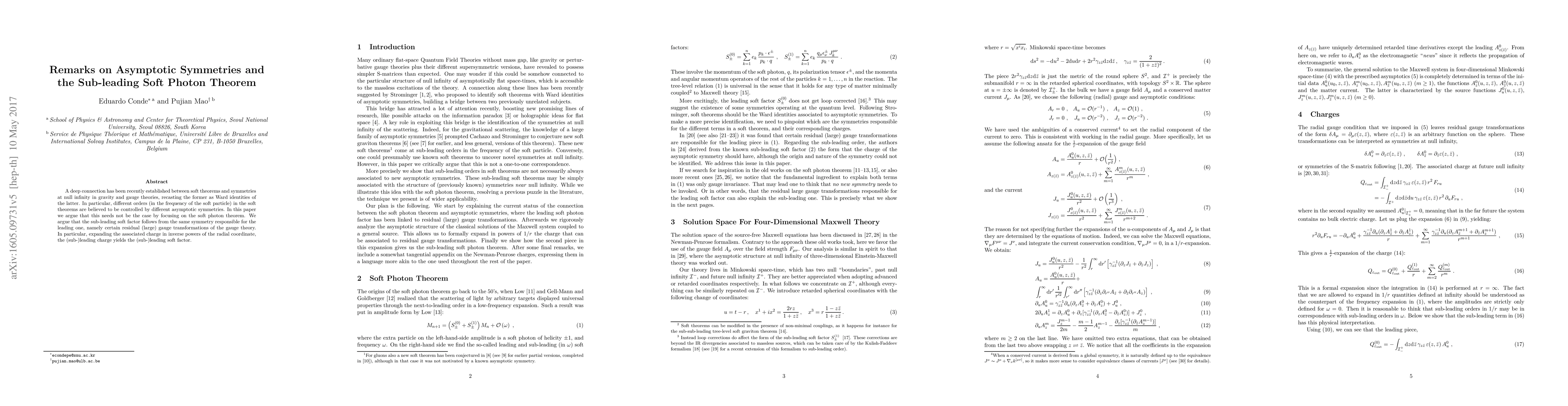 This paper explores the relationship between asymptotic symmetries and soft theorems, specifically arguing that contrary to previous beliefs, both the leading and sub-leading soft photon factors arise from the same residual gauge transformations rather than different symmetries. It demonstrates that the sub-leading charge, expanded in inverse powers of the radial coordinate, produces the sub-leading soft factor.