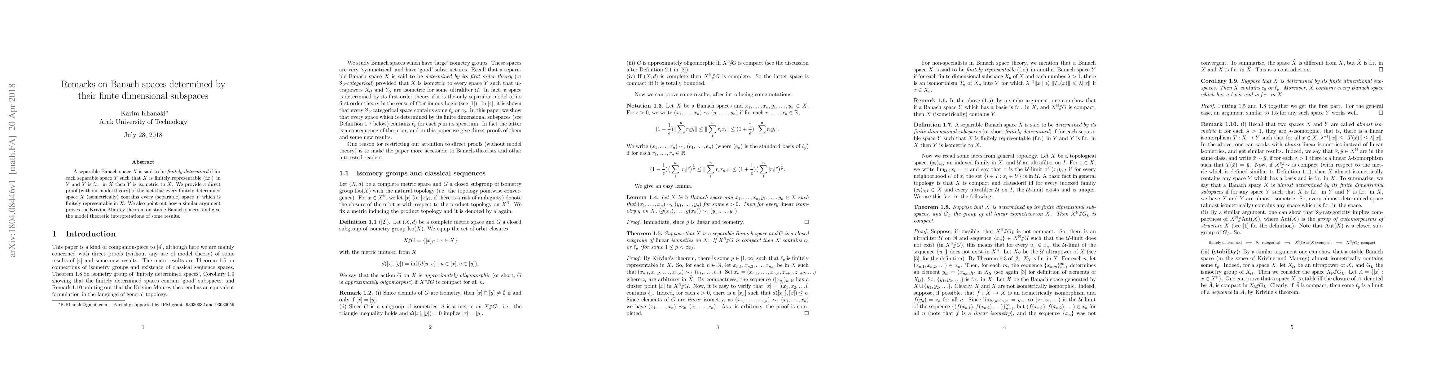 A separable Banach space $X$ is said to be finitely determined if for each separable space $Y$ such that $X$ is finitely representable (f.r.) in $Y$ and $Y$ is f.r. in $X$ then $Y$ is isometric to $X$. We provide a direct proof (without model theory) of the fact that every finitely determined space $X$ (isometrically) contains every (separable) space $Y$ which is finitely representable in $X$. We also point out how a similar argument proves the Krivine-Maurey theorem on stable Banach spaces, and give the model theoretic interpretations of some results.
