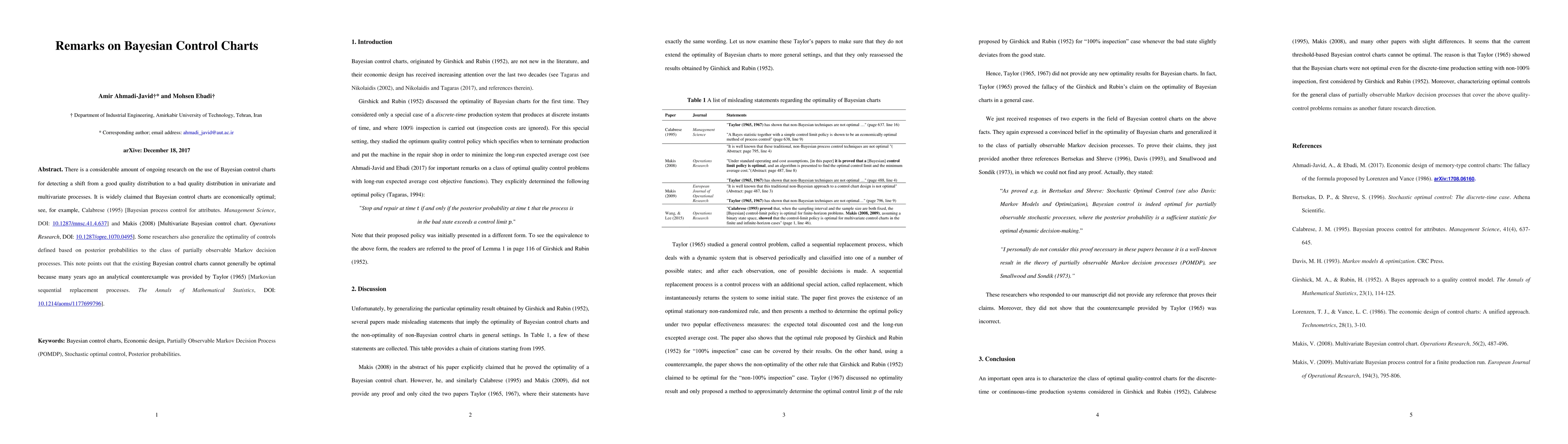 Existing Bayesian control charts are not always optimal due to limitations identified in a 1965 analytical counterexample, contradicting claims of their economic optimality.