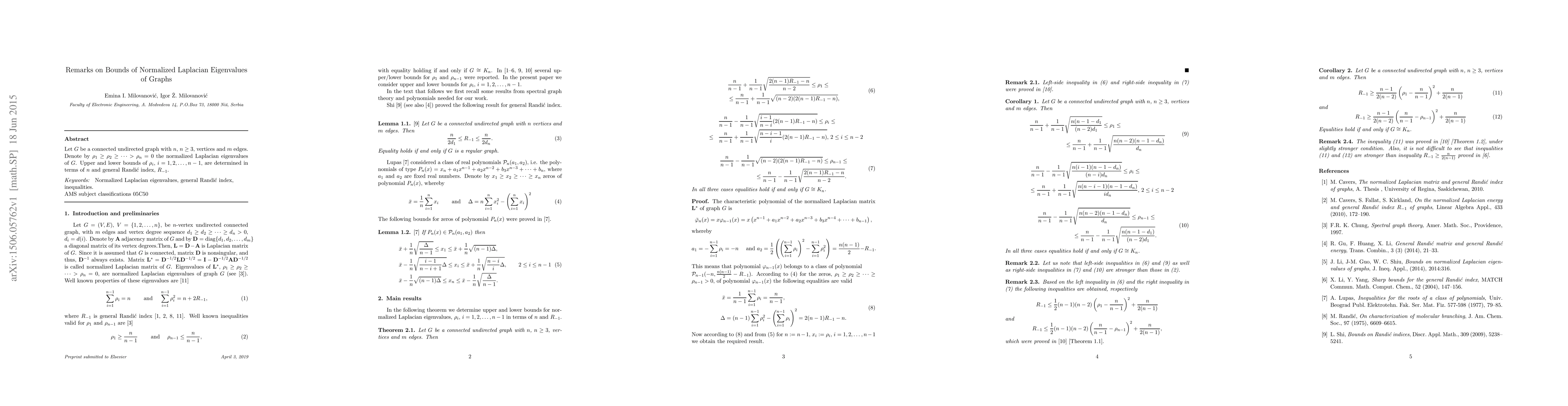Let $G$ be a connected undirected graph with $n$, $n\ge 3$, vertices and $m$ edges. Denote by $\rho_1 \ge \rho_2 \ge \cdots > \rho_n =0$ the normalized Laplacian eigenvalues of $G$. Upper and lower bounds of $\rho_i$, $i=1,2,\ldots , n-1$, are determined in terms of $n$ and general Randi\' c index, $R_{-1}$.