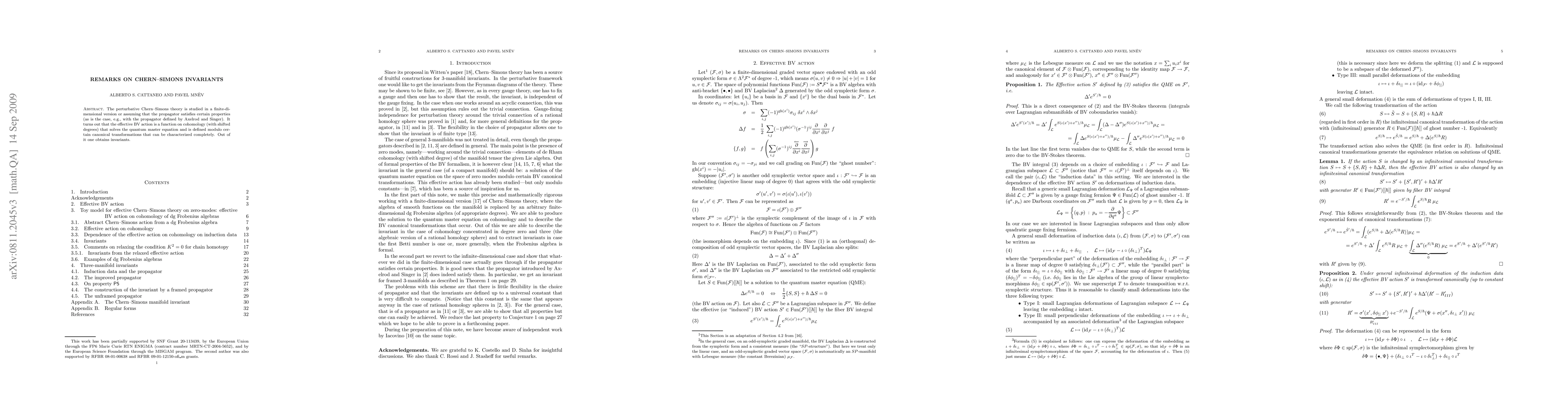 The paper examines perturbative Chern-Simons theory under specific conditions on the propagator, demonstrating that the effective BV action leads to invariants defined modulo specific canonical transformations. These invariants are functions on cohomology with shifted degrees satisfying the quantum master equation.