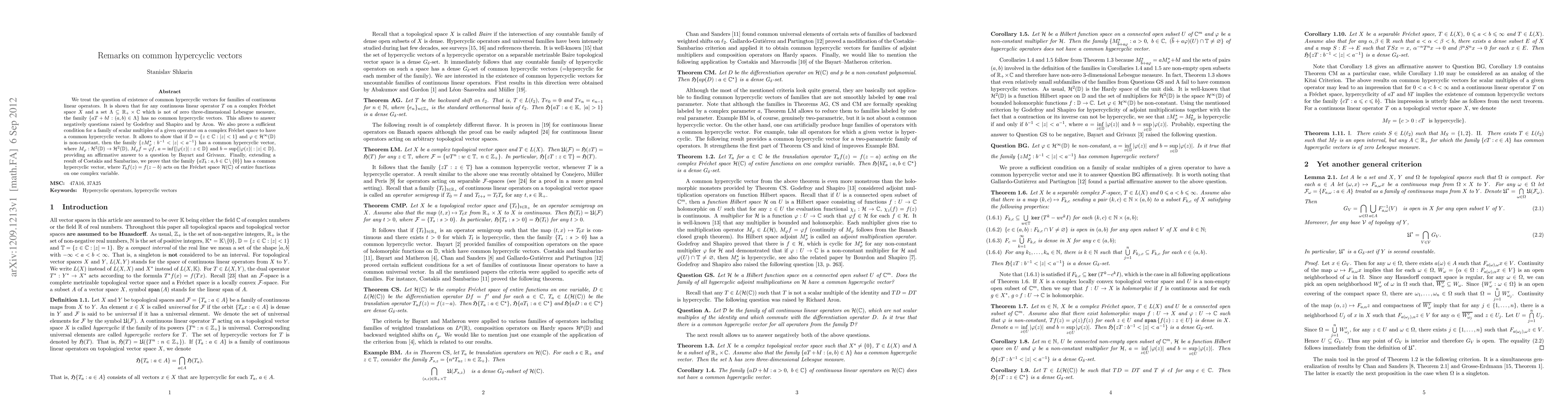 This paper investigates the existence of common hypercyclic vectors for families of continuous linear operators on complex Fréchet spaces. It demonstrates that certain families, including those parameterized by a set with non-zero three-dimensional Lebesgue measure, lack common hypercyclic vectors, answering negatively questions raised by Godefroy, Shapiro, Aron, and others. It also provides a sufficient condition for families of scalar multiples to have common hypercyclic vectors, confirming the existence of such vectors in specific families of operators.