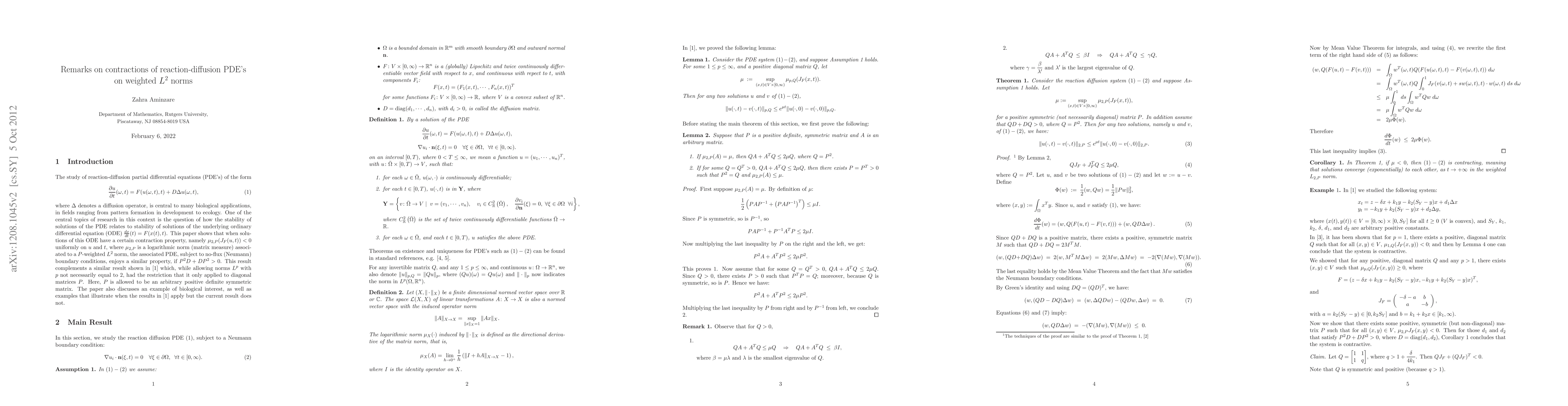In [1], we showed contractivity of reaction-diffusion PDE: \frac{\partial u}{\partial t}({\omega},t) = F(u({\omega},t)) + D\Delta u({\omega},t) with Neumann boundary condition, provided \mu_{p,Q}(J_F (u)) < 0 (uniformly on u), for some 1 \leq p \leq \infty and some positive, diagonal matrix Q, where J_F is the Jacobian matrix of F. This note extends the result for Q weighted L_2 norms, where Q is a positive, symmetric (not merely diagonal) matrix and Q^2D+DQ^2>0.