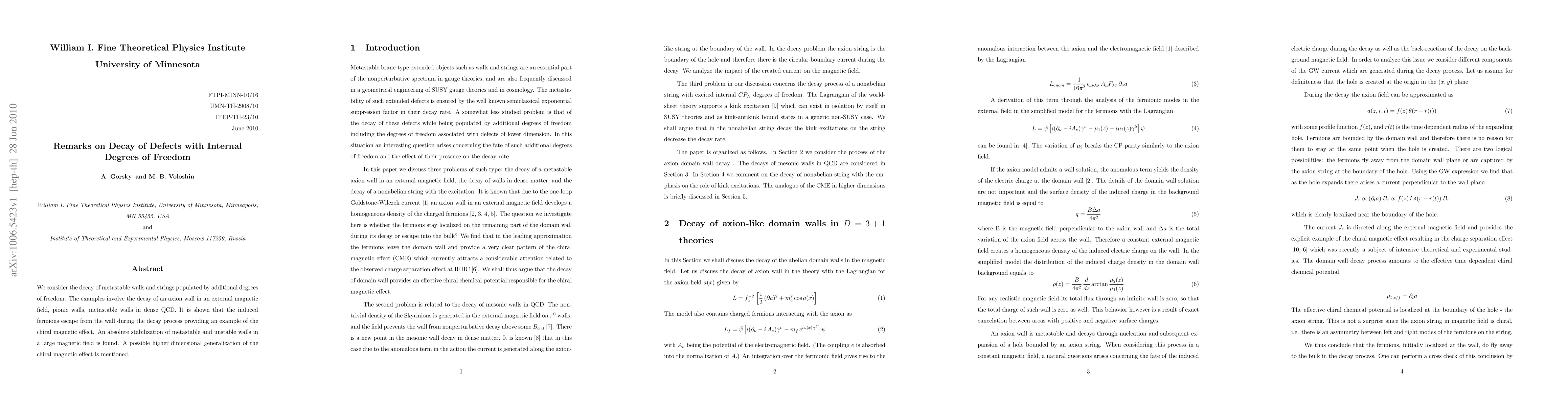 We consider the decay of metastable walls and strings populated by additional degrees of freedom. The examples involve the decay of an axion wall in an external magnetic field, pionic walls, metastable walls in dense QCD. It is shown that the induced fermions escape from the wall during the decay process providing an example of the chiral magnetic effect. An absolute stabilization of metastable and unstable walls in a large magnetic field is found. A possible higher dimensional generalization of the chiral magnetic effect is mentioned.