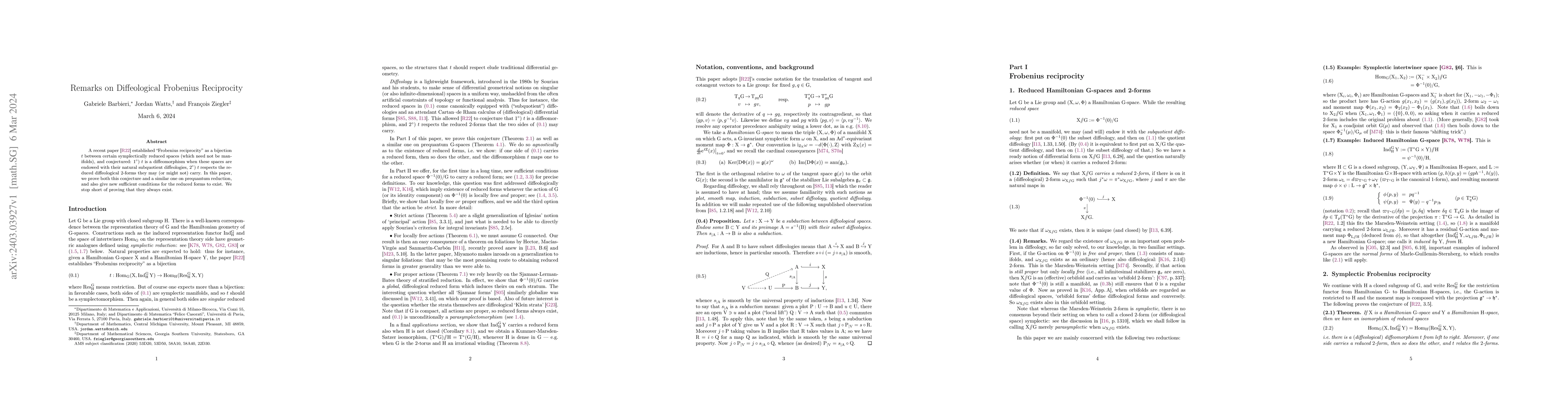 This paper proves the conjectured Frobenius reciprocity bijection $t$ between symplectically reduced spaces as a diffeomorphism under natural subquotient diffeologies, and respects reduced diffeological $2$-forms. It also provides new conditions for the existence of reduced forms but does not confirm their universal existence.