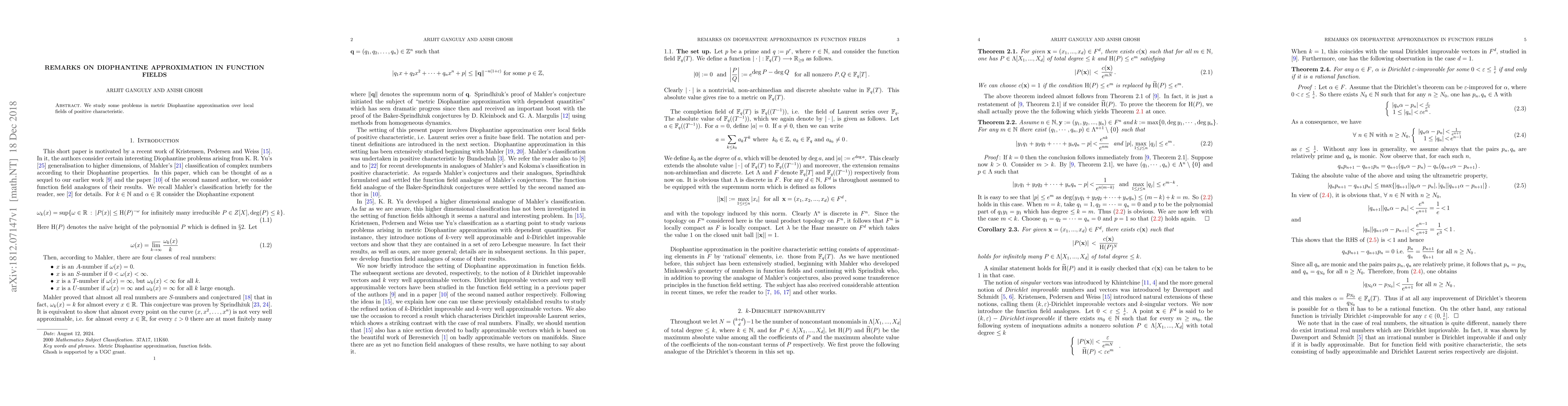 Summary: This paper investigates metric Diophantine approximation in local fields with positive characteristic, focusing on the behavior and properties of such approximations in function fields. The study aims to understand the nuances of approximation in these non-standard settings.