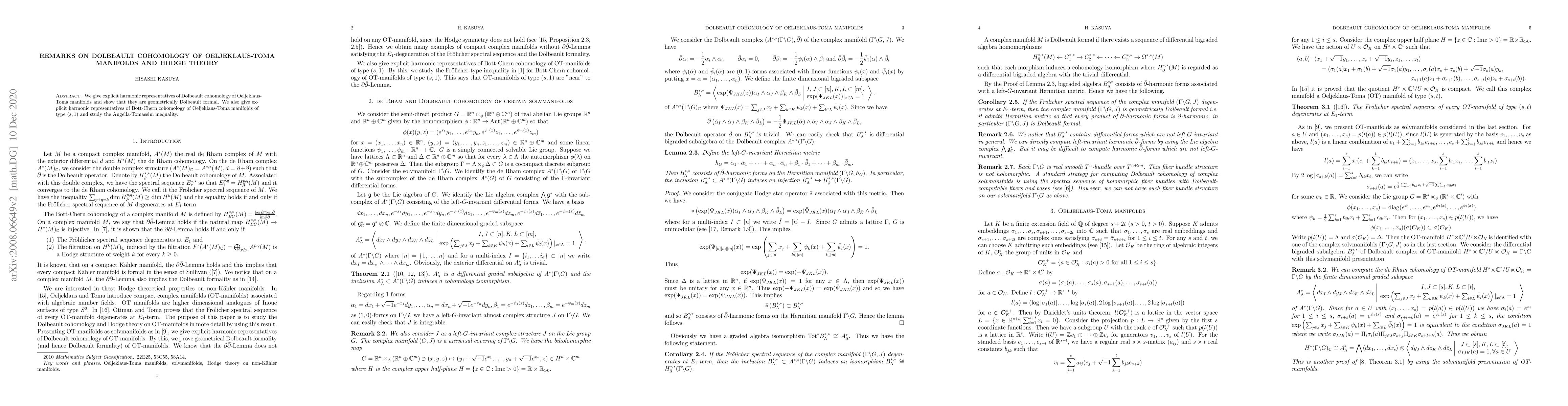 Two-line summary: This paper provides explicit harmonic representatives for the Dolbeault cohomology of Oeljeklaus-Toma manifolds, demonstrating their geometric Dolbeault formality. Additionally, it presents harmonic representatives for Bott-Chern cohomology of specific Oeljeklaus-Toma types and examines the Angella-Tomassini inequality.