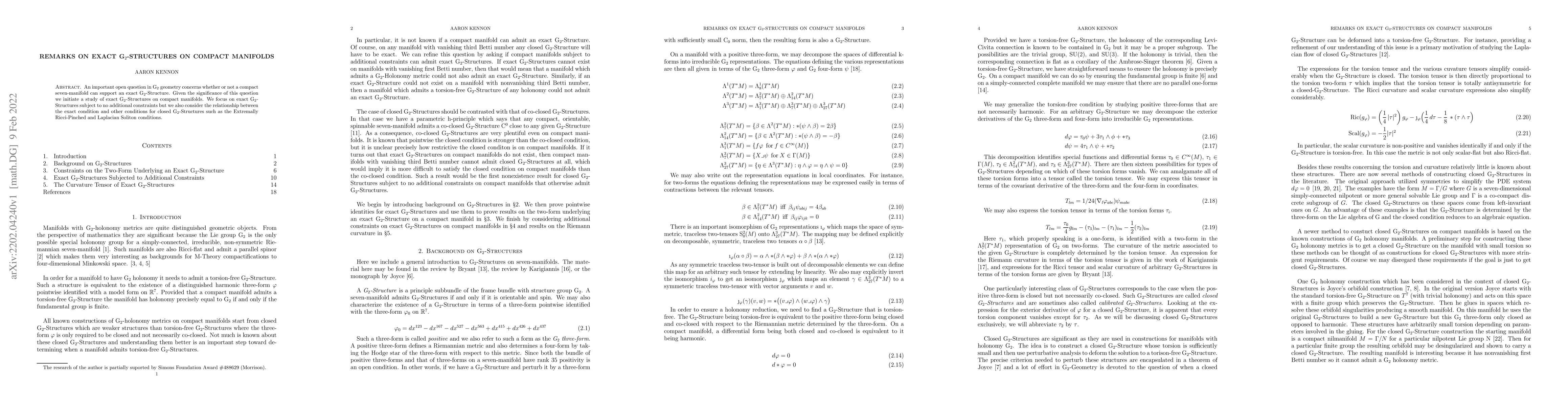 An important open question in G$_{2}$ geometry concerns whether or not a compact seven-manifold can support an exact G$_{2}$-Structure. Given the significance of this question we initiate a study of exact G$_{2}$-Structures on compact manifolds. We focus on exact G$_2$-Structures subject to no additional constraints but we also consider the relationship between the exact condition and other conditions for closed G$_{2}$-Structures such as the Extremally Ricci-Pinched and Laplacian Soliton conditions.