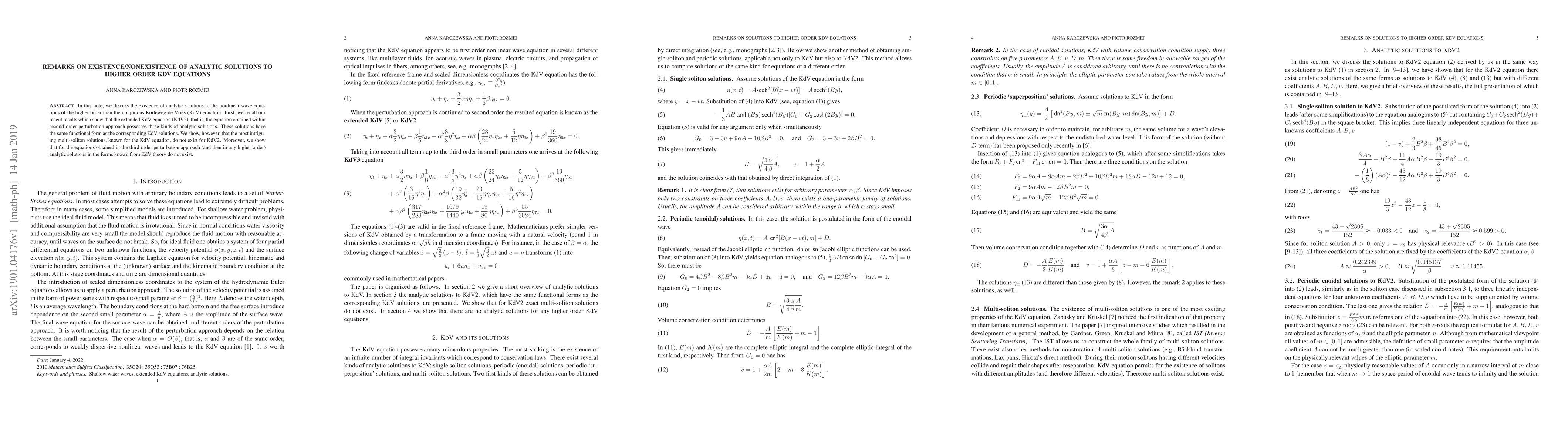 In this note, we discuss the existence of analytic solutions to the nonlinear wave equations of the higher order than the ubiquitous Korteweg-de Vries (KdV) equation. First, we recall our recent results which show that the extended KdV equation (KdV2), that is, the equation obtained within second-order perturbation approach possesses three kinds of analytic solutions. These solutions have the same functional form as the corresponding KdV solutions. We show, however, that the most intriguing multi-soliton solutions, known for the KdV equation, do not exist for KdV2. Moreover, we show that for the equations obtained in the third order perturbation approach (and then in any higher order) analytic solutions in the forms known from KdV theory do not exist.