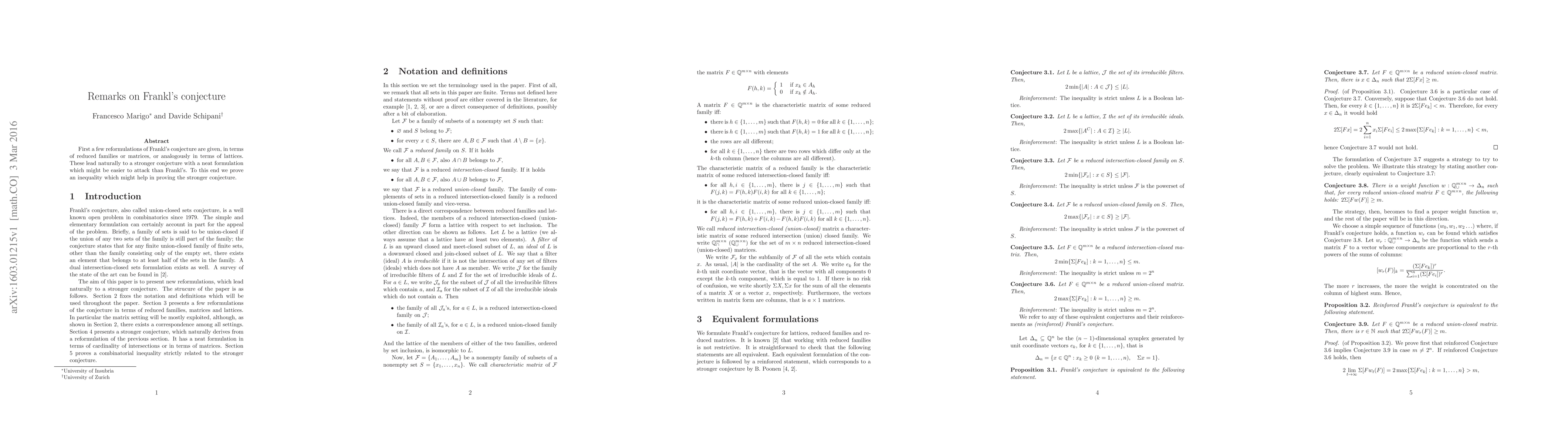 Summary: The paper reformulates Frankl's conjecture using reduced families, matrices, or lattices, proposes a stronger version of the conjecture, and establishes an inequality that may facilitate proving this enhanced conjecture.