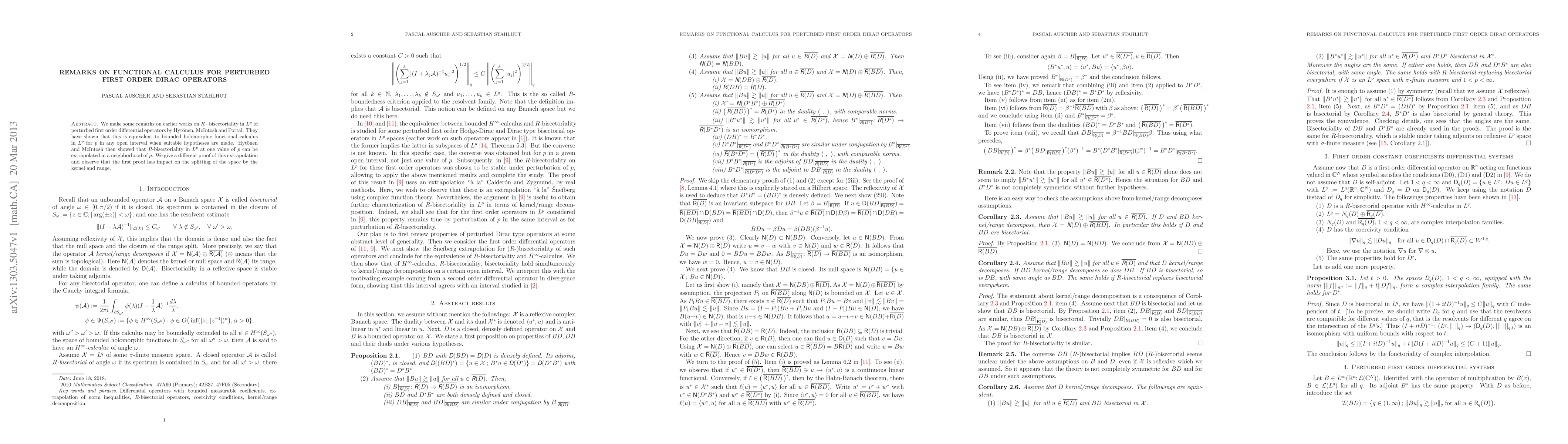 We make some remarks on earlier works on $R-$bisectoriality in $L^p$ of perturbed first order differential operators by Hyt\"onen, McIntosh and Portal. They have shown that this is equivalent to bounded holomorphic functional calculus in $L^p$ for $p$ in any open interval when suitable hypotheses are made. Hyt\"onen and McIntosh then showed that $R$-bisectoriality in $L^p$ at one value of $p$ can be extrapolated in a neighborhood of $p$. We give a different proof of this extrapolation and observe that the first proof has impact on the splitting of the space by the kernel and range.