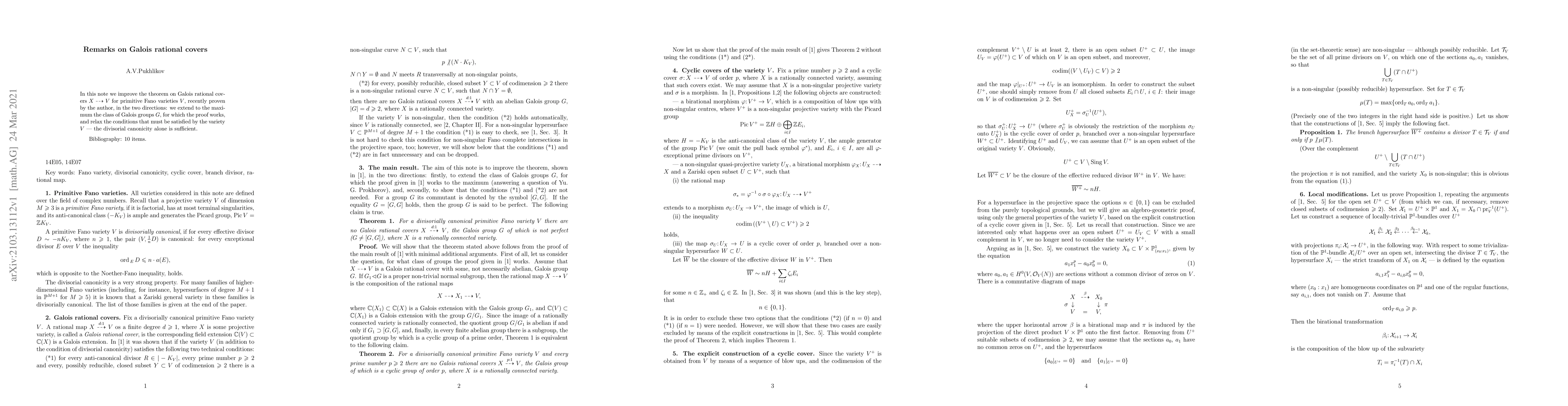 The paper refines the theorem on Galois rational covers for primitive Fano varieties, extending the applicable class of Galois groups and requiring only divisorial canonicity for the variety. This enhances the original proof's flexibility and broadness.