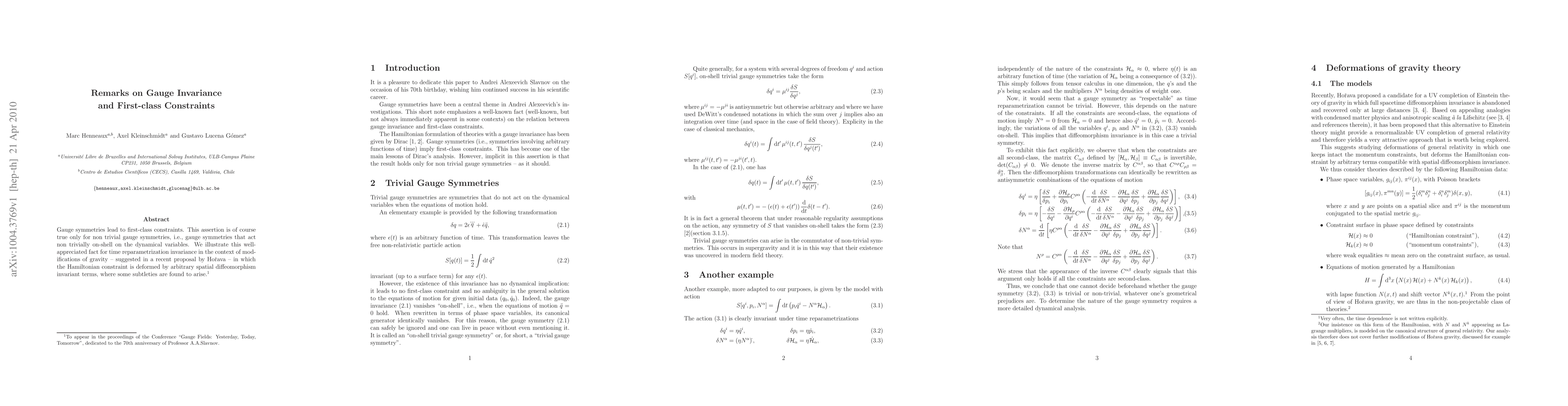 Gauge symmetries lead to first-class constraints. This assertion is of course true only for non trivial gauge symmetries, i.e., gauge symmetries that act non trivially on-shell on the dynamical variables. We illustrate this well-appreciated fact for time reparametrization invariance in the context of modifications of gravity -suggested in a recent proposal by Horava-in which the Hamiltonian constraint is deformed by arbitrary spatial diffeomorphism invariant terms, where some subtleties are found to arise.