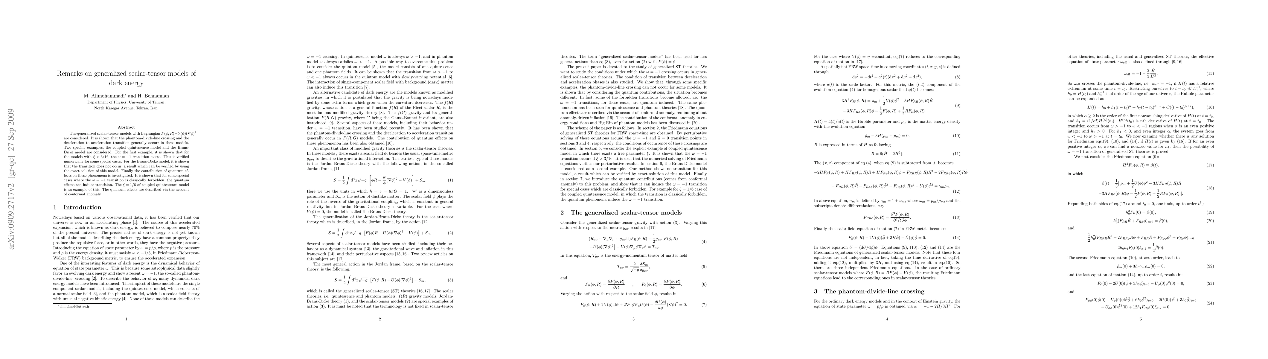 The generalized scalar-tensor models with Lagrangian $F(\phi,R)-U(\phi)(\nabla\phi)^2$ are considered. It is shown that the phantom-divide-line crossing and the deceleration to acceleration transition generally occurr in these models. Two specific examples, the coupled quintessence model and the Brans-Dicke model are considered. For the first example, it is shown that for the models with $\xi>3/16$, the $\omega=-1$ transition exists. This is verified numerically for some special cases. For the Brans-Dicke model, it is shown that the transition does not occur, a result which can be verified by using the exact solution of this model. Finally the contribution of quantum effects on these phenomena is investigated. It is shown that for some special cases where the $\omega=-1$ transition is classically forbidden, the quantum effects can induce transition. The $\xi=1/6$ of coupled quintessence model is an example of this. The quantum effects are described via the account of conformal anomaly.