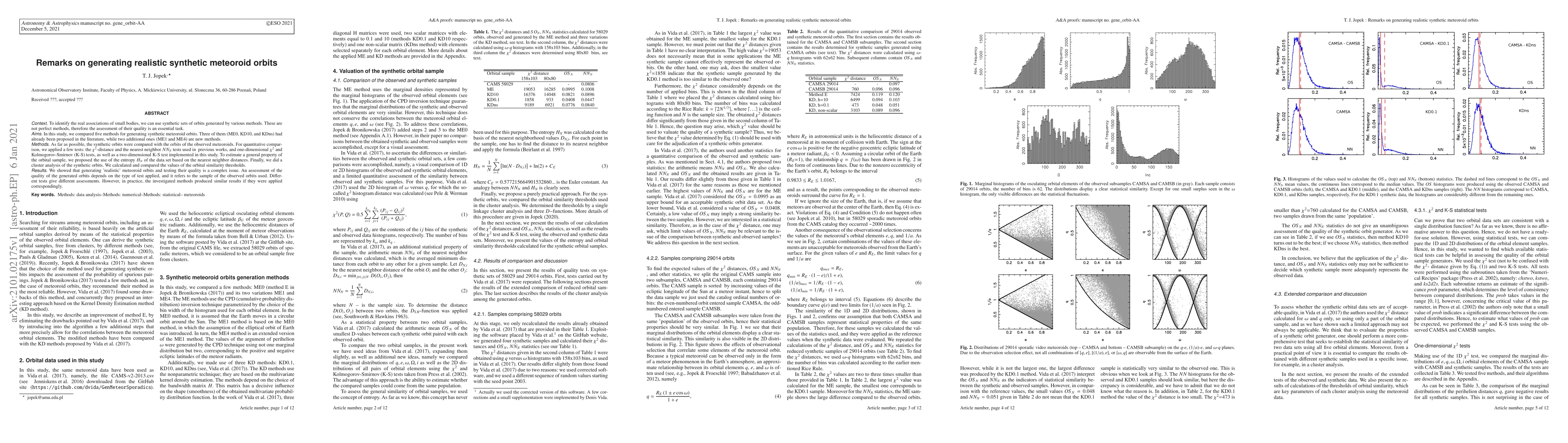Context. To identify the real associations of small bodies, we can use synthetic sets of orbits generated by various methods. These are not perfect methods, therefore the assessment of their quality is an essential task. Aims. In this study, we compared five methods for generating synthetic meteoroid orbits. Three of them (ME0, KD10, and KDns) had already been proposed in the literature, while two additional ones (ME1 and ME4) are new methods. Methods. As far as possible, the synthetic orbits were compared with the orbits of the observed meteoroids. For quantitative comparison, we applied a few tests: the chi-square distance and the nearest neighbor NN_N tests used in previous works, and one-dimensional chi-square and Kolmogorov-Smirnov (K-S) tests, as well as a two-dimensional K-S test implemented in this study. To estimate a general property of the orbital sample, we proposed the use of the entropy H_N of the data set based on the nearest neighbor distances. Finally, we did a cluster analysis of the synthetic orbits. We calculated and compared the values of the orbital similarity thresholds. Results. We showed that generating 'realistic' meteoroid orbits and testing their quality is a complex issue. An assessment of the quality of the generated orbits depends on the type of test applied, and it refers to the sample of the observed orbits used. Different tests give different assessments. However, in practice, the investigated methods produced similar results if they were applied correspondingly.
