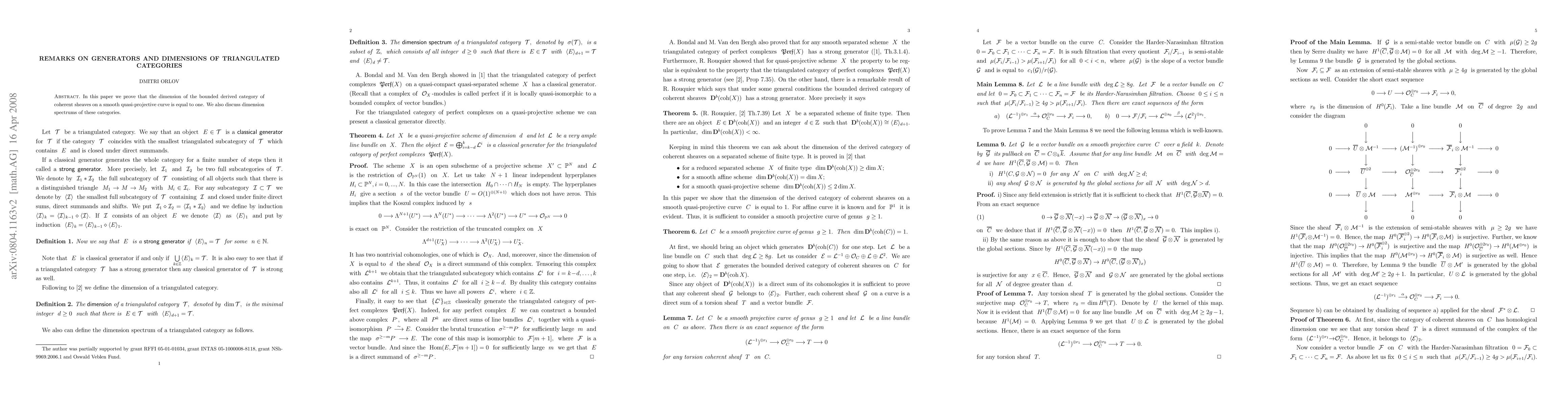 This paper proves that the dimension of the bounded derived category of coherent sheaves on a smooth quasi-projective curve is equal to one, with implications for understanding dimensions of triangulated categories.