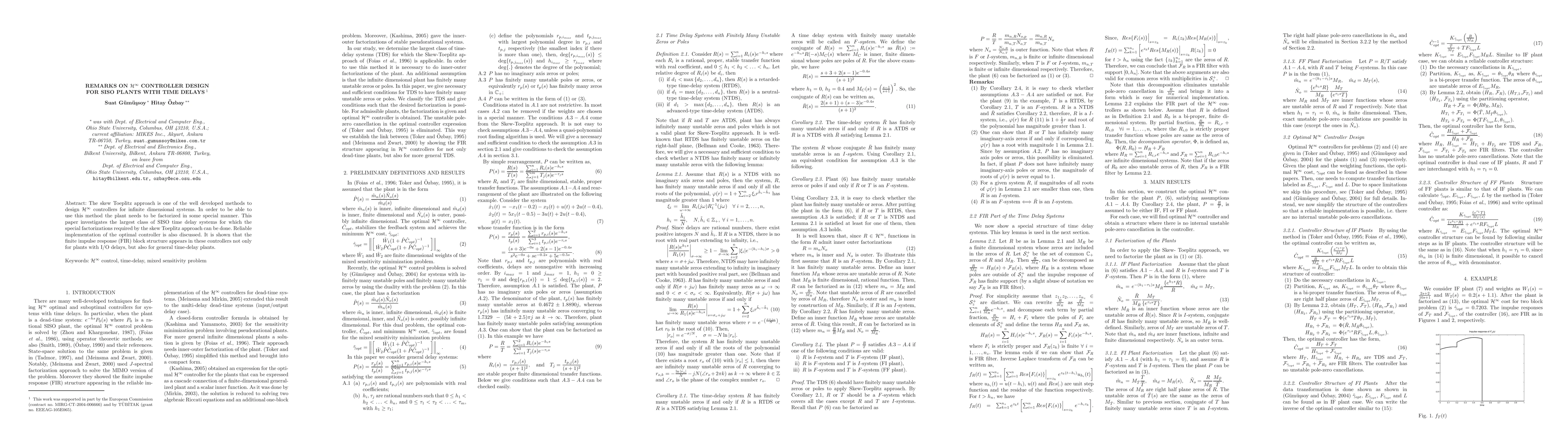 This paper explores the use of the skew Toeplitz approach for designing H-infinity controllers for SISO plants with time delays, identifying the largest class of such systems that allow for the necessary special factorizations. It also discusses the implementation of the optimal controller, revealing that FIR block structures emerge in controllers for both plants with I/O delays and general time-delay systems.