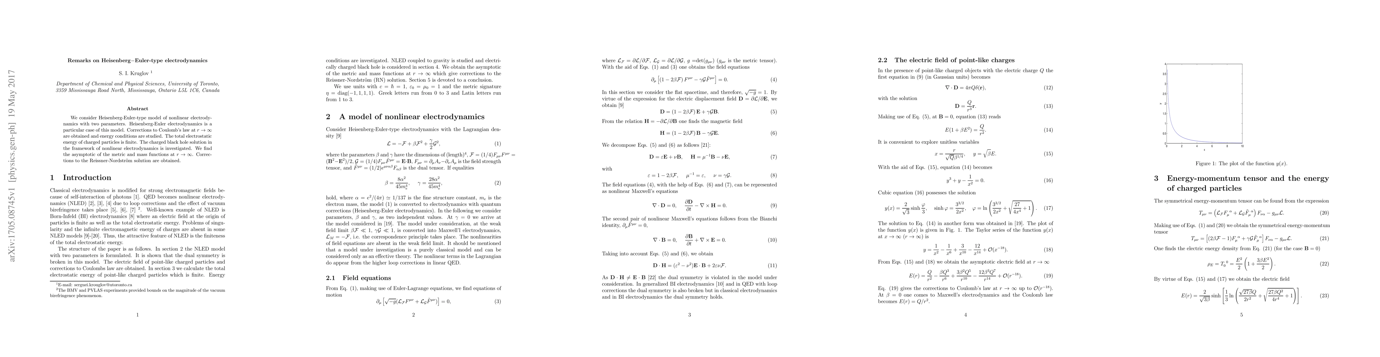 This paper explores a nonlinear electrodynamics model with two parameters, deriving corrections to Coulomb's law and studying energy conditions. It investigates the charged black hole solution, finding asymptotic behaviors of the metric and mass functions, and obtaining corrections to the Reissner-Nordström solution.