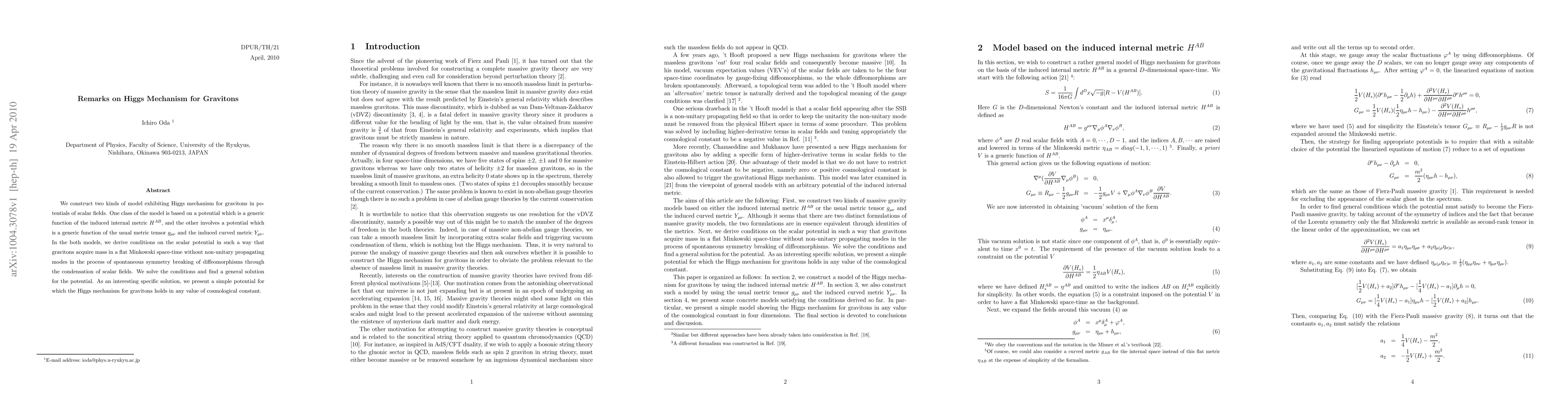 The paper presents explicit models and potentials for gravitons acquiring mass via a Higgs mechanism, extending previous work on massive gravity theories.