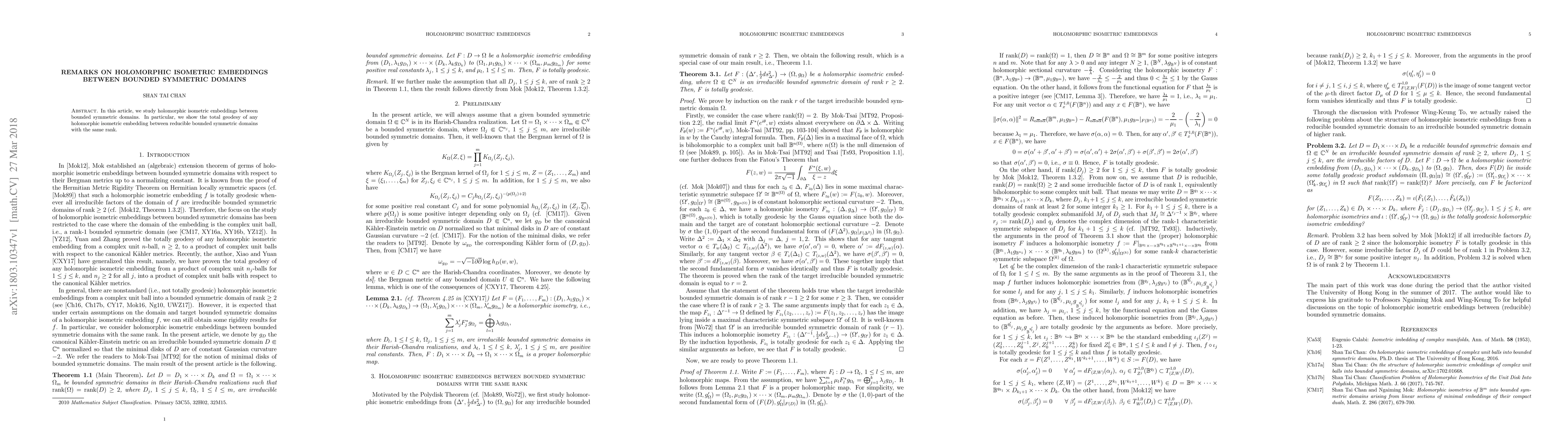 Summary: This paper investigates holomorphic isometric embeddings between bounded symmetric domains, proving that any such embedding between reducible domains of the same rank is totally geodesic.