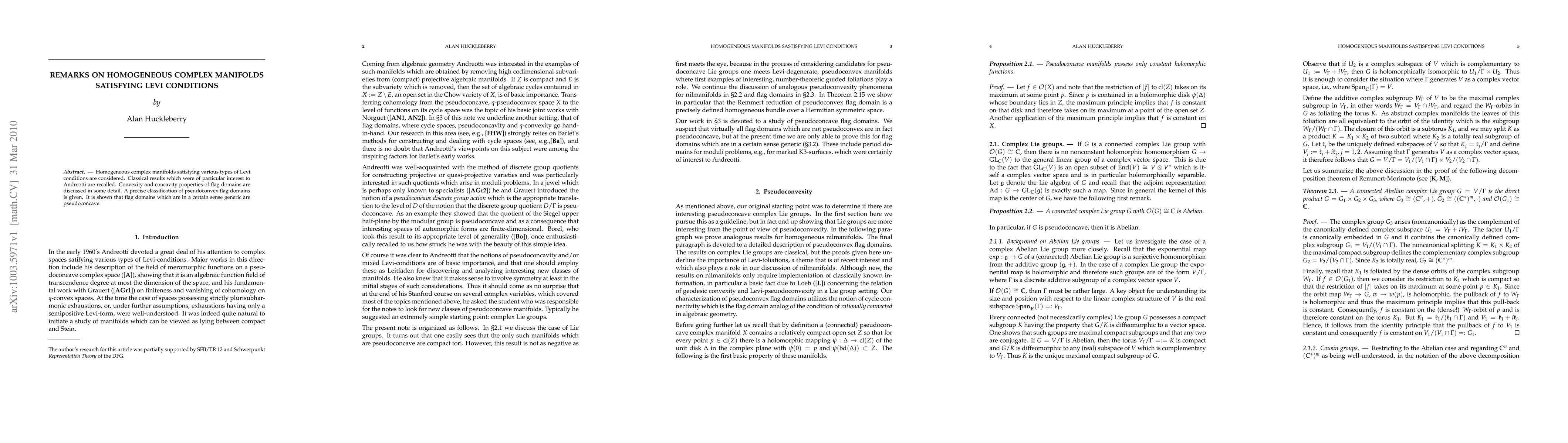 Homogeneous complex manifolds satisfying various types of Levi conditions are considered. Classical results which were of particular interest to Andreotti are recalled. Convexity and concavity properties of flag domains are discussed in some detail. A precise classification of pseudoconvex flag domains is given. It is shown that flag domains which are in a certain sense generic are pseudoconcave.