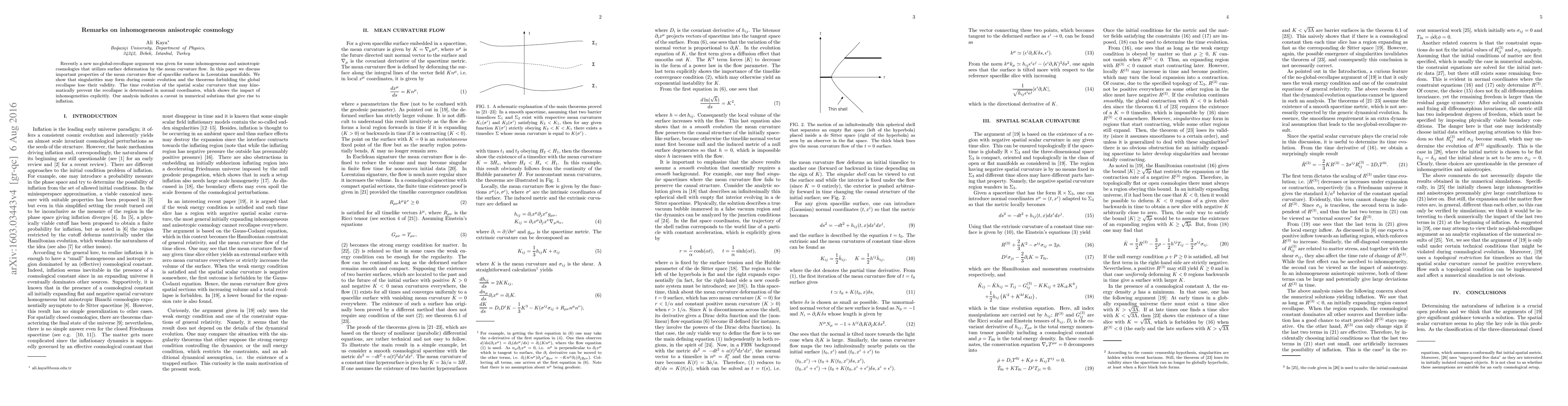Recently a new no-global-recollapse argument was given for some inhomogeneous and anisotropic cosmologies that utilizes surface deformation by the mean curvature flow. In this paper we discuss important properties of the mean curvature flow of spacelike surfaces in Lorentzian manifolds. We show that singularities may form during cosmic evolution and the theorems forbidding the global recollapse lose their validity. The time evolution of the spatial scalar curvature that may kinematically prevent the recollapse is determined in normal coordinates, which shows the impact of inhomogeneities explicitly. Our analysis indicates a caveat in numerical solutions that give rise to inflation.