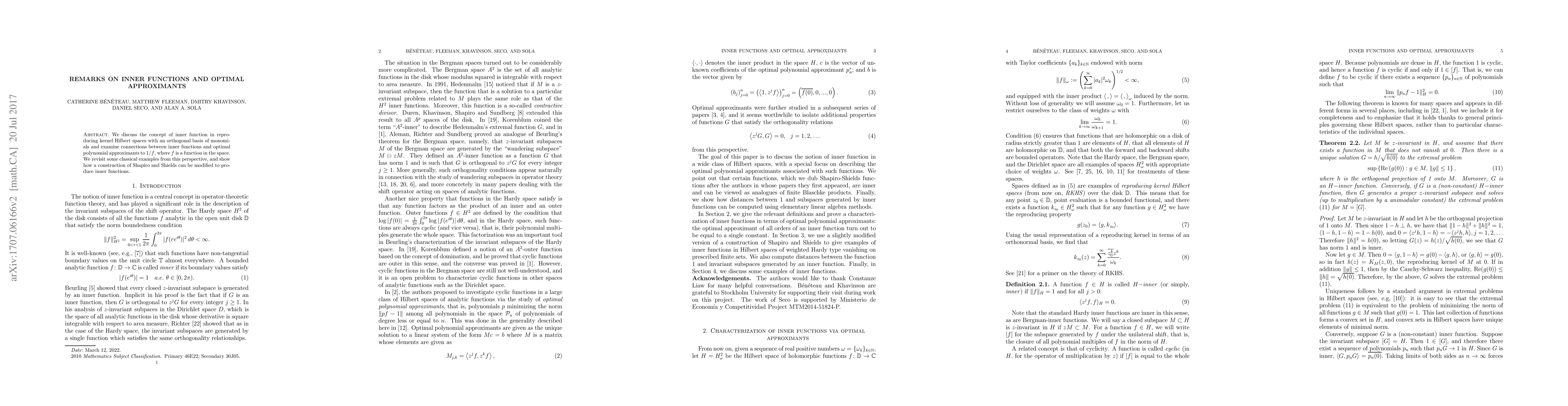 We discuss the concept of inner function in reproducing kernel Hilbert spaces with an orthogonal basis of monomials and examine connections between inner functions and optimal polynomial approximants to $1/f$, where $f$ is a function in the space. We revisit some classical examples from this perspective, and show how a construction of Shapiro and Shields can be modified to produce inner functions.