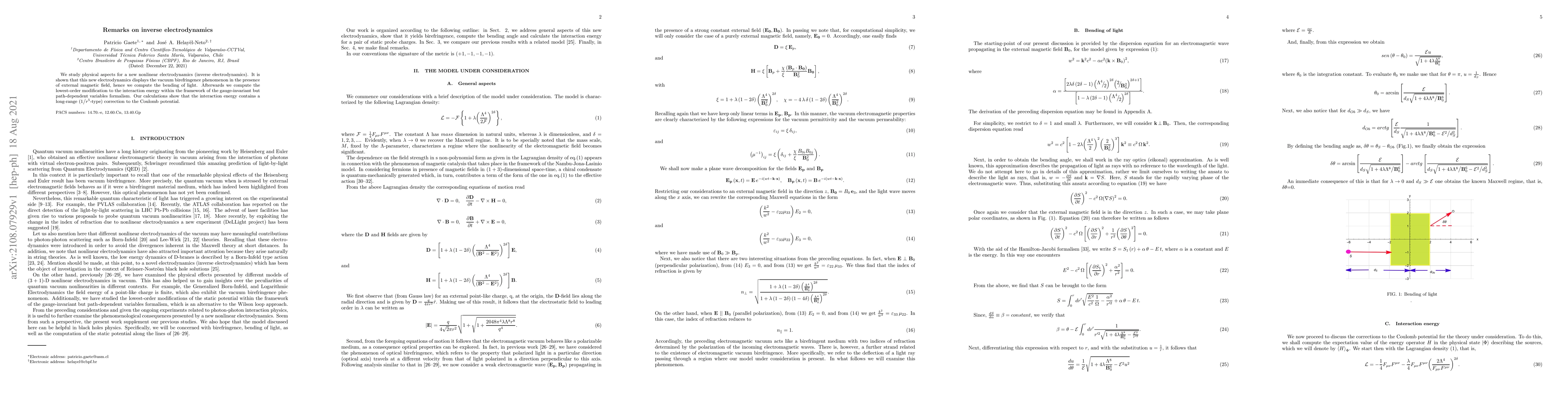 This paper explores a new nonlinear electrodynamics termed inverse electrodynamics, revealing vacuum birefringence and light bending under external magnetic fields. It also identifies a long-range correction to the Coulomb potential in the interaction energy.
