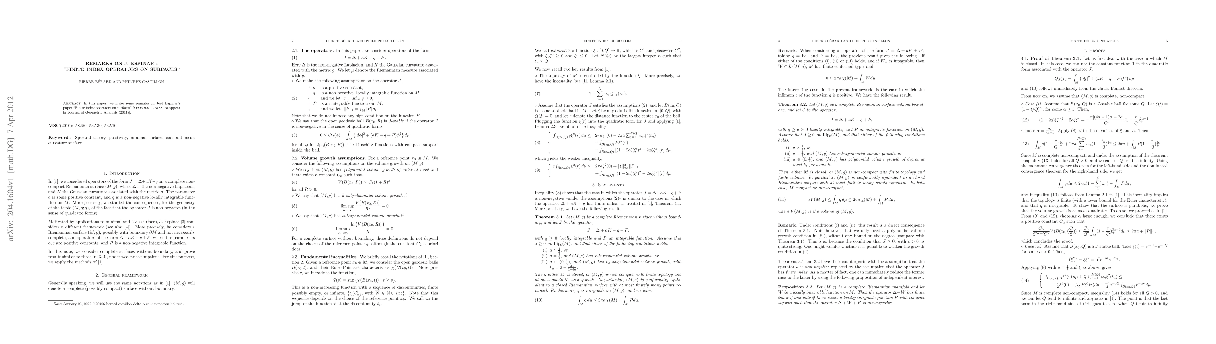In this paper, we make some remarks on Jos\'e Espinar's paper "Finite index operators on surfaces" [\texttt{arXiv:0911.3767}, to appear in Journal of Geometric Analysis (2011)].