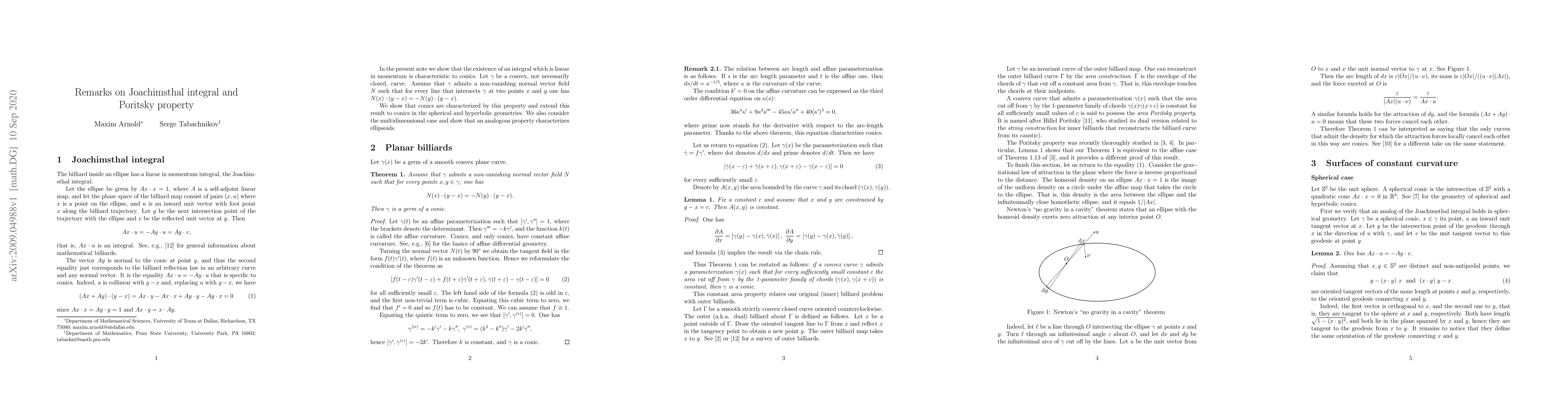 The billiard in an ellipse has an integral linear in momentum, the Joachimsthal integral. We show that the existence of such an integral characterizes conics. We extend this result to the spherical and hyperbolic geometries and to higher dimensions. We connect the existence of Joachimsthal integral with the Poritsky property, a property of billiard curves, called so after H. Poritsky whose important 1950 paper was one of the early studies of the billiard problem.