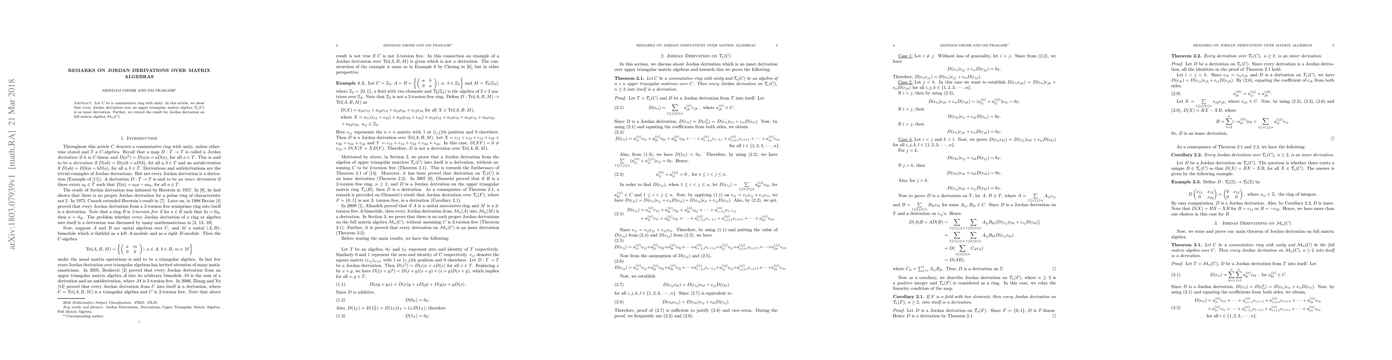 Let C be a commutative ring with unity. In this article, we show that every Jordan derivation over an upper triangular matrix algebra T_n(C) is an inner derivation. Further, we extend the result for Jordan derivation on full matrix algebra M_n(C).