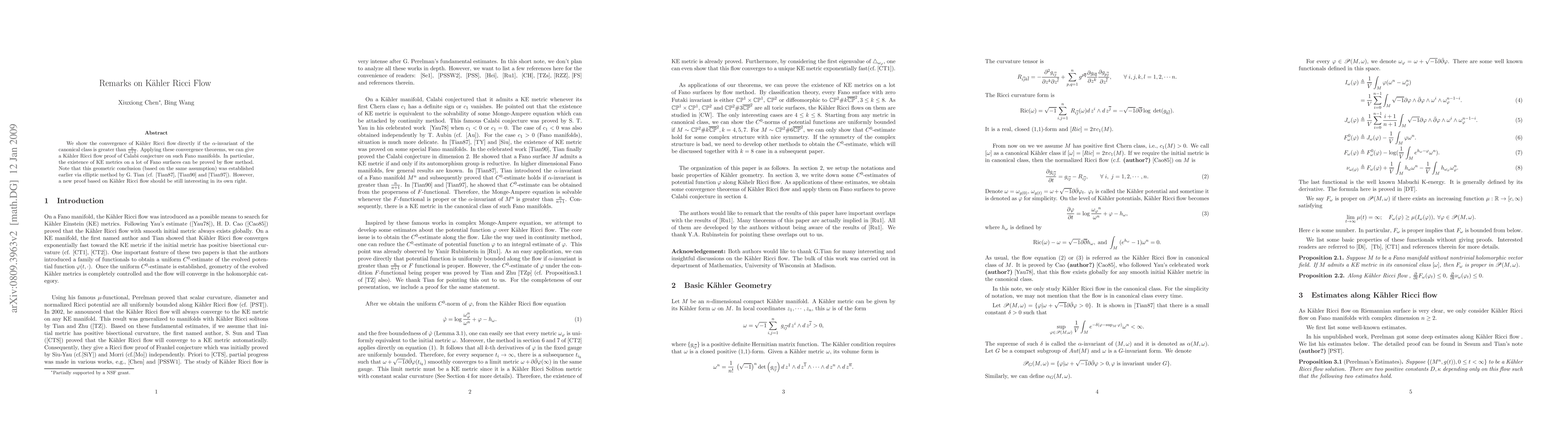 This paper investigates estimates along the Kähler Ricci flow on Fano manifolds and demonstrates the flow's convergence when the $\alpha$-invariant exceeds $\frac{n}{n+1}$. It provides a new flow-based proof for Calabi conjecture on such manifolds, particularly proving the existence of Kähler-Einstein metrics on many Fano surfaces, contrasting earlier elliptic proofs.