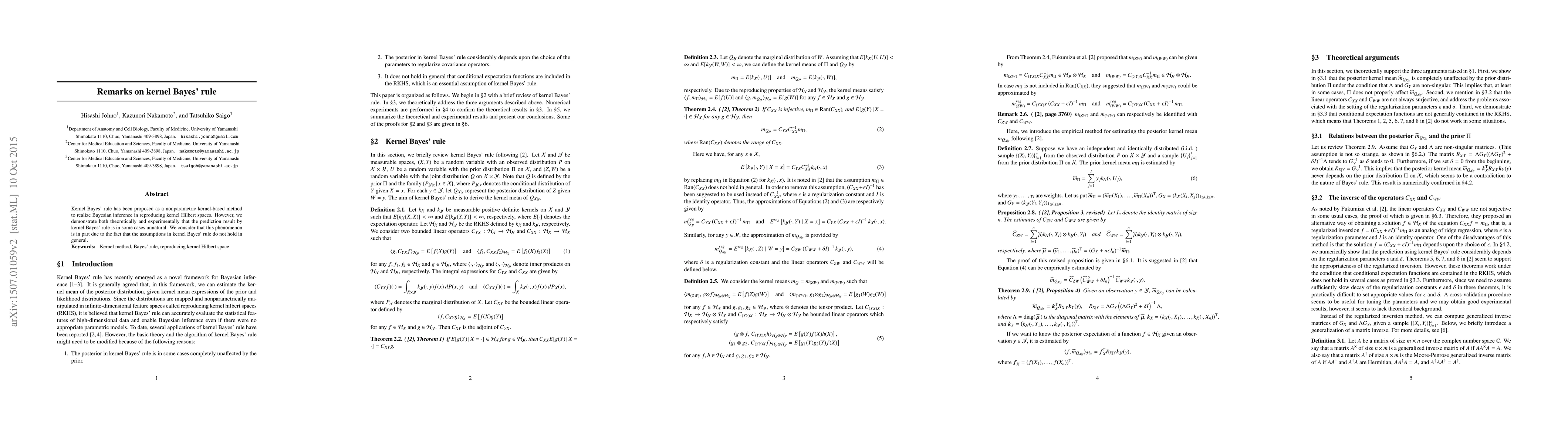 Summary: This paper critiques kernel Bayes' rule, showing both theoretically and experimentally that its predictions can be unnatural due to its assumptions not always holding true in general nonparametric settings. The authors suggest that this highlights limitations in the method's applicability.