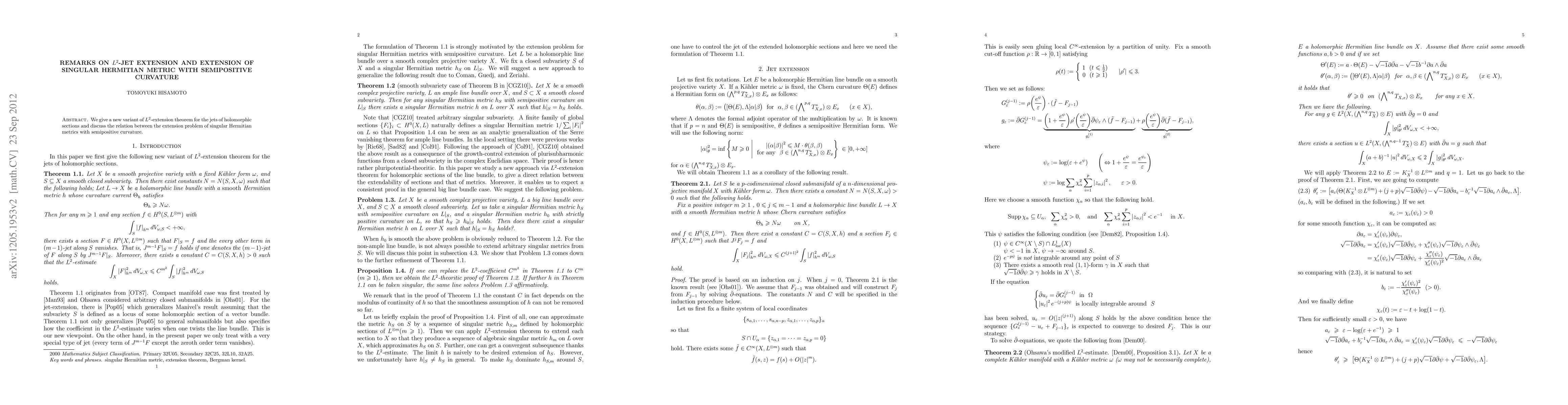Summary: This paper presents a novel $L^2$-extension theorem for holomorphic sections' jets and explores the connection between extending singular Hermitian metrics with semipositive curvature.