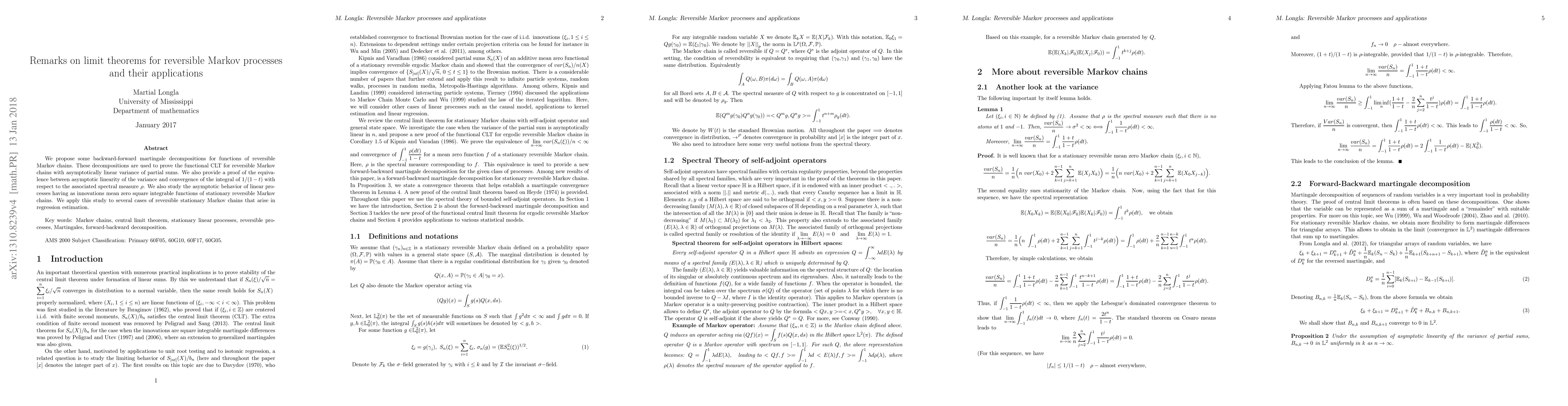 We propose some backward-forward martingale decompositions for functions of reversible Markov chains. These decompositions are used to prove the functional CLT for reversible Markov chains with asymptotically linear variance of partial sums. We also provide a proof of the equivalence between asymptotic linearity of the variance and convergence of the integral of $1/(1-t)$ with respect to the associated spectral measure $\rho$. We also study the asymptotic behavior of linear processes having as innovations mean zero square integrable functions of stationary reversible Markov chains. We apply this study to several cases of reversible stationary Markov chains that arise in regression estimation.