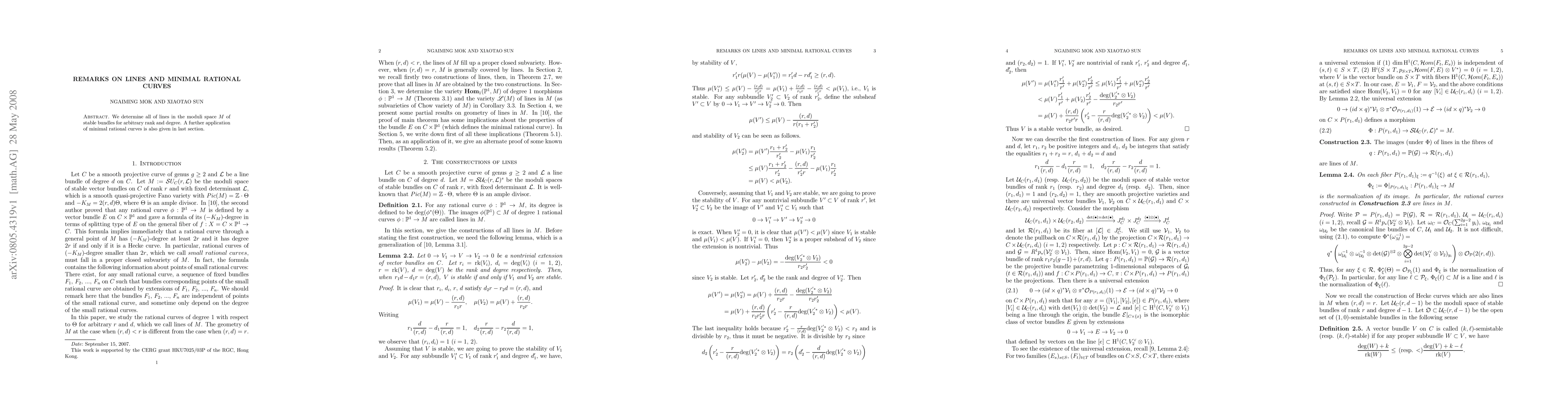 Summary: This paper identifies all lines in the moduli space $M$ of stable bundles for various ranks and degrees, and concludes with an application involving minimal rational curves.