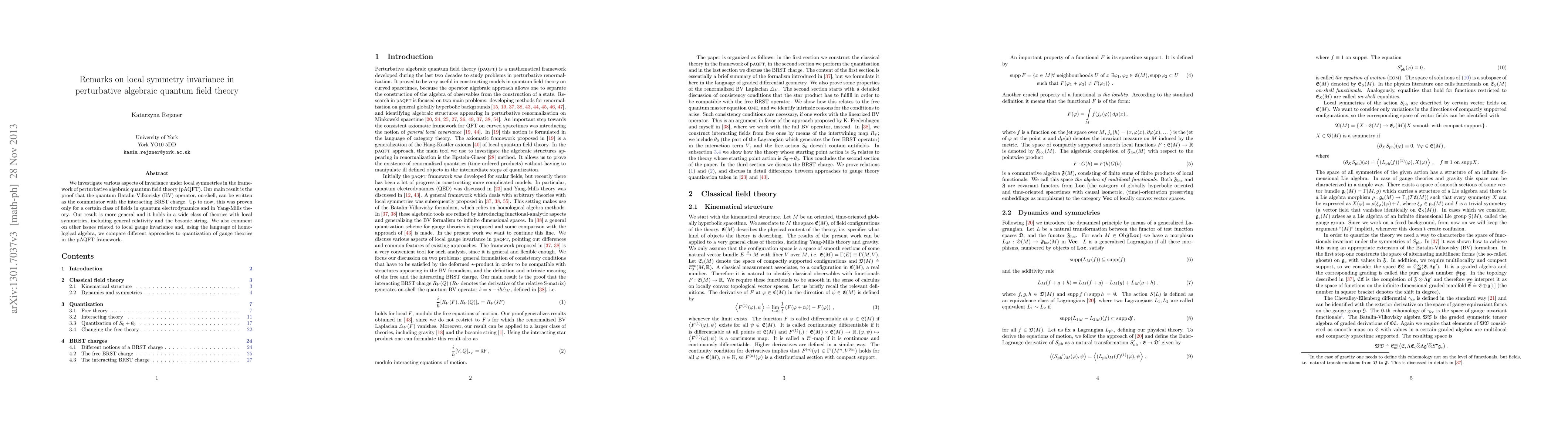 We investigate various aspects of invariance under local symmetries in the framework of perturbative algebraic quantum field theory (pAQFT). Our main result is the proof that the quantum Batalin-Vilkovisky (BV) operator, on-shell, can be written as the commutator with the interacting BRST charge. Up to now, this was proven only for a certain class of fields in quantum electrodynamics and in Yang-Mills theory. Our result is more general and it holds in a wide class of theories with local symmetries, including general relativity and the bosonic string. We also comment on other issues related to local gauge invariance and, using the language of homological algebra, we compare different approaches to quantization of gauge theories in the pAQFT framework.