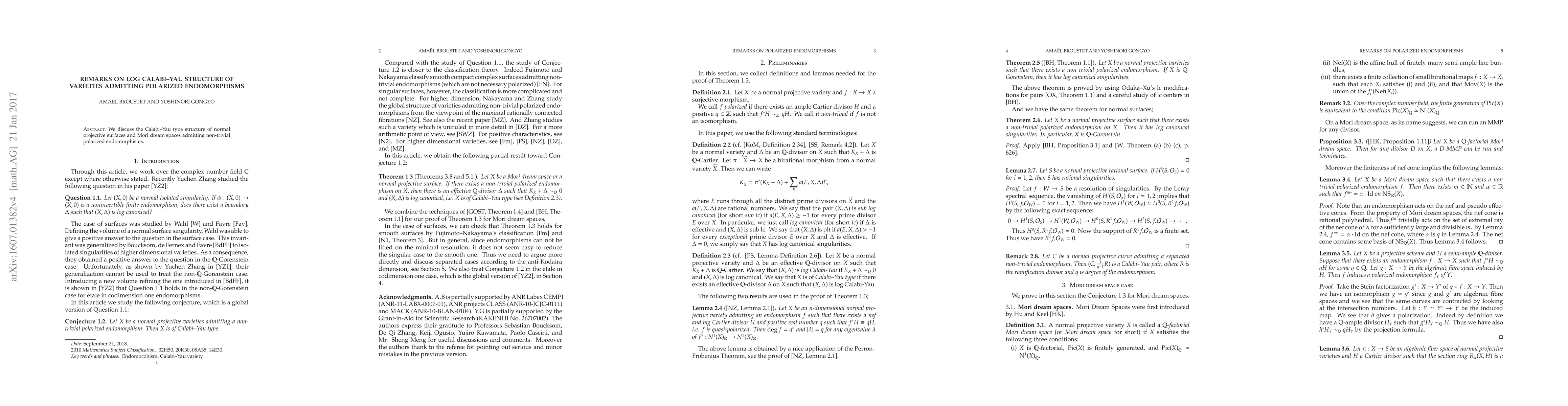 We discuss the Calabi--Yau type structure of normal projective surfaces and Mori dream spaces admitting a non-trivial polarized endomorphism.