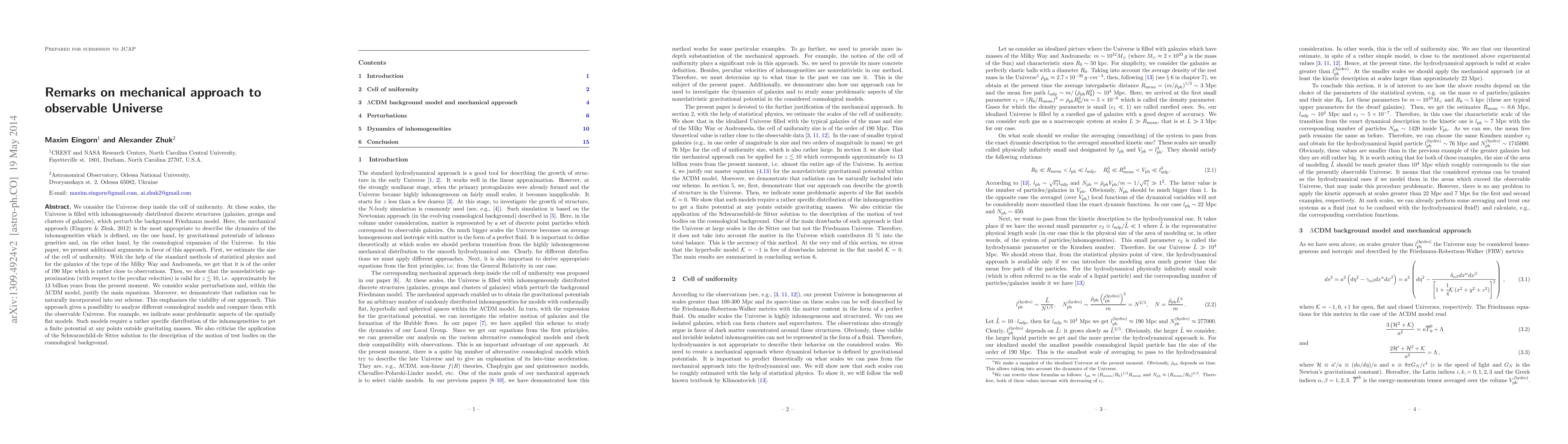 We consider the Universe deep inside the cell of uniformity. At these scales, the Universe is filled with inhomogeneously distributed discrete structures (galaxies, groups and clusters of galaxies), which perturb the background Friedmann model. Here, the mechanical approach (Eingorn & Zhuk, 2012) is the most appropriate to describe the dynamics of the inhomogeneities which is defined, on the one hand, by gravitational potentials of inhomogeneities and, on the other hand, by the cosmological expansion of the Universe. In this paper, we present additional arguments in favor of this approach. First, we estimate the size of the cell of uniformity. With the help of the standard methods of statistical physics and for the galaxies of the type of the Milky Way and Andromeda, we get that it is of the order of 190 Mpc which is rather close to observations. Then, we show that the nonrelativistic approximation (with respect to the peculiar velocities) is valid for $z \lesssim 10$, i.e. approximately for 13 billion years from the present moment. We consider scalar perturbations and, within the $\Lambda$CDM model, justify the main equations. Moreover, we demonstrate that radiation can be naturally incorporated into our scheme. This emphasizes the viability of our approach. This approach gives a possibility to analyze different cosmological models and compare them with the observable Universe. For example, we indicate some problematic aspects of the spatially flat models. Such models require a rather specific distribution of the inhomogeneities to get a finite potential at any points outside gravitating masses. We also criticize the application of the Schwarzschild-de Sitter solution to the description of the motion of test bodies on the cosmological background.