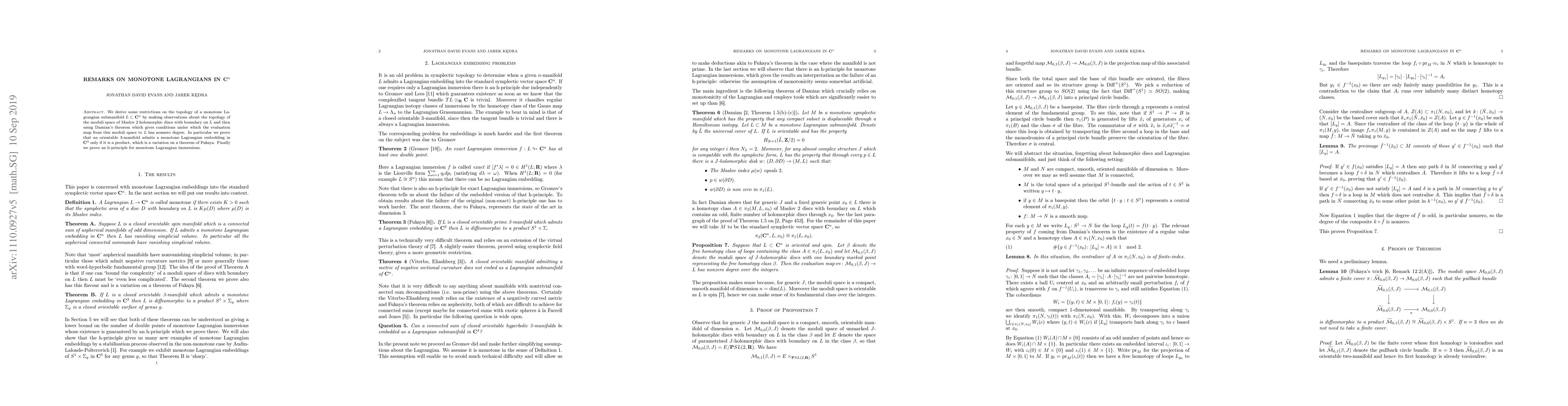 We derive some restrictions on the topology of a monotone Lagrangian submanifold $L\subset\mathbf{C}^n$ by making observations about the topology of the moduli space of Maslov 2 holomorphic discs with boundary on $L$ and then using Damian's theorem which gives conditions under which the evaluation map from this moduli space to $L$ has nonzero degree. In particular we prove that an orientable 3-manifold admits a monotone Lagrangian embedding in $\mathbf{C}^3$ only if it is a product, which is a variation on a theorem of Fukaya. Finally we prove an h-principle for monotone Lagrangian immersions.