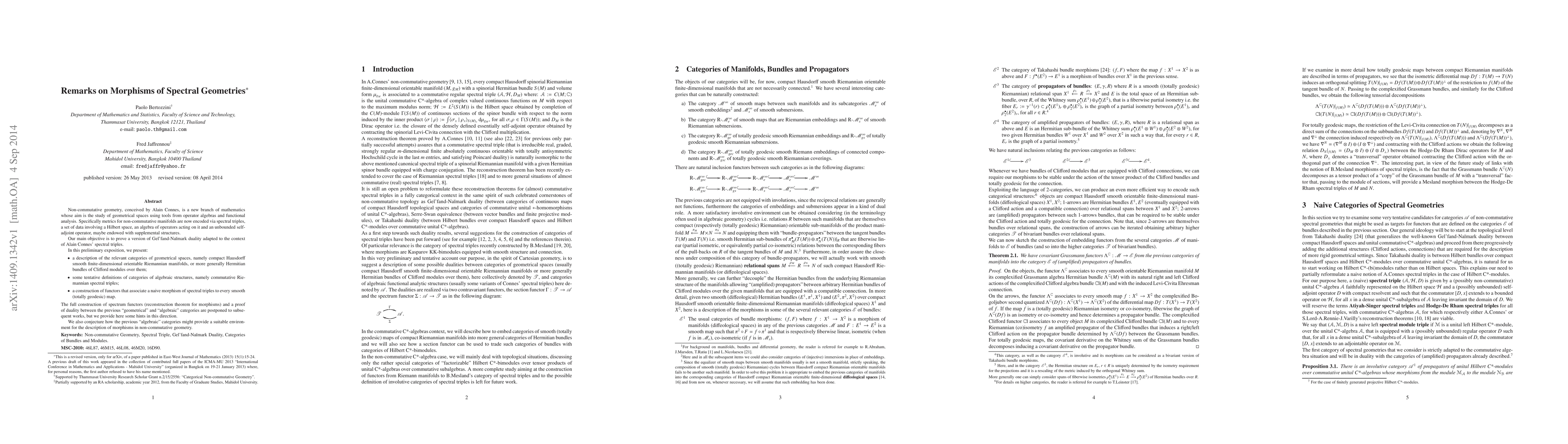 Having in view the study of a version of Gel'fand-Neumark duality adapted to the context of Alain Connes' spectral triples, in this very preliminary review, we first present a description of the relevant categories of geometrical spaces, namely compact Hausdorff smooth finite-dimensional orientable Riemannian manifolds (or more generally Hermitian bundles of Clifford modules over them); we give some tentative definitions of the relevant categories of algebraic structures, namely "propagators" and "spectral correspondences" of commutative Riemannian spectral triples; and we provide a construction of functors that associate a naive morphism of spectral triples to every smooth (totally geodesic) map. The full construction of spectrum functors (reconstruction theorem for morphisms) and a proof of duality between the previous "geometrical' and "algebraic" categories are postponed to subsequent works, but we provide here some hints in this direction. We also show how the previous categories of "propagators" of commutative C*-algebras embed in the mildly non-commutative environments of categories of suitable Hilbert C*-bimodules, factorizable over commutative C*-algebras, with composition given by internal tensor product.